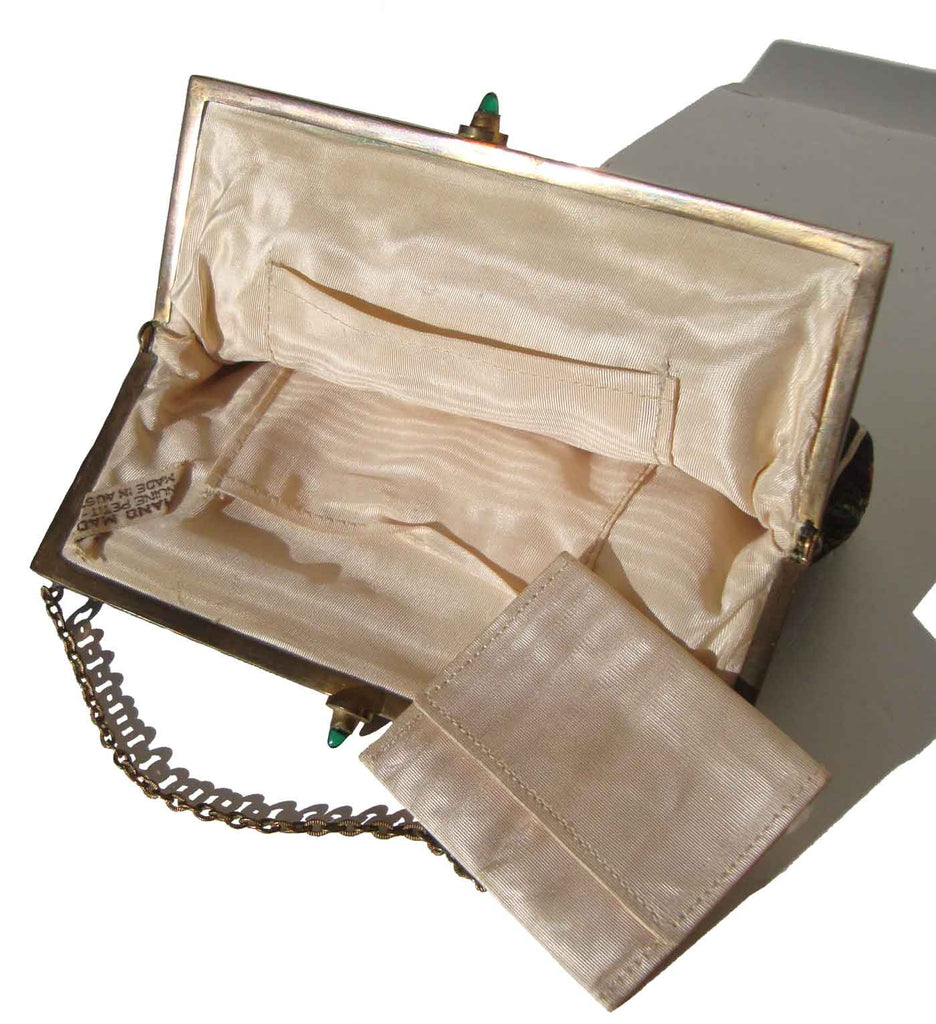 The bag is also fully lined in a pale peach colored satin, with side pockets and small change purse as shown.