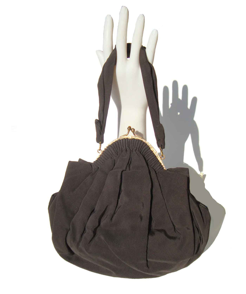 So stylish and elegant in design is this vintage ladies handbag with coffee brown color and ruched and puckered details, circa 1940s.