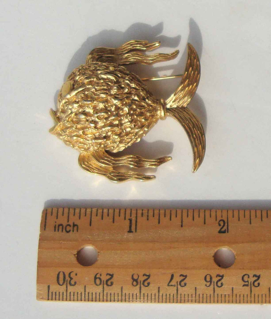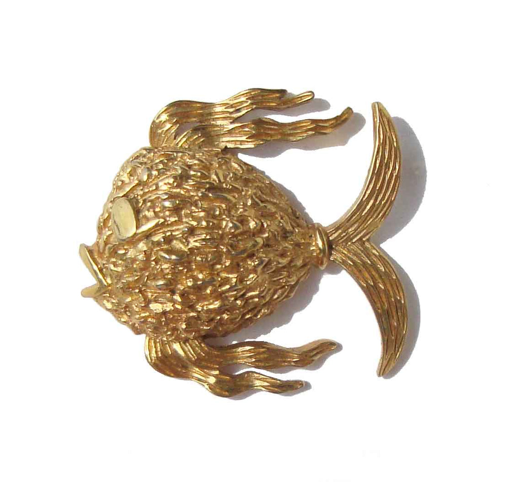 The whimsical brooch is well cast with goldplated surface, and is in the form of a round shaped fish with long wavy fins and split tail.