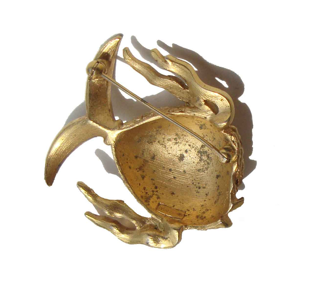 Otherwise, the fish is in good condition and also has a flat shiny ‘eye’, defined lips, measures approximately 1&3/4 inches wide at its widest point by 1&5/8 inches high, weighs 23.6 grams, and is signed “Trifari” with crown.