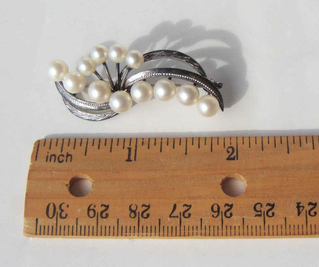 The mid-century pin consists of sterling silver with openwork design and engraved surface – and set with 12 genuine pearls measuring approximately 4mm to 6mm in size.