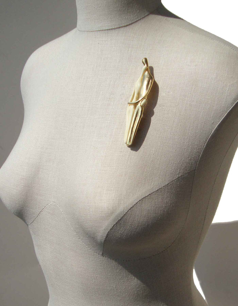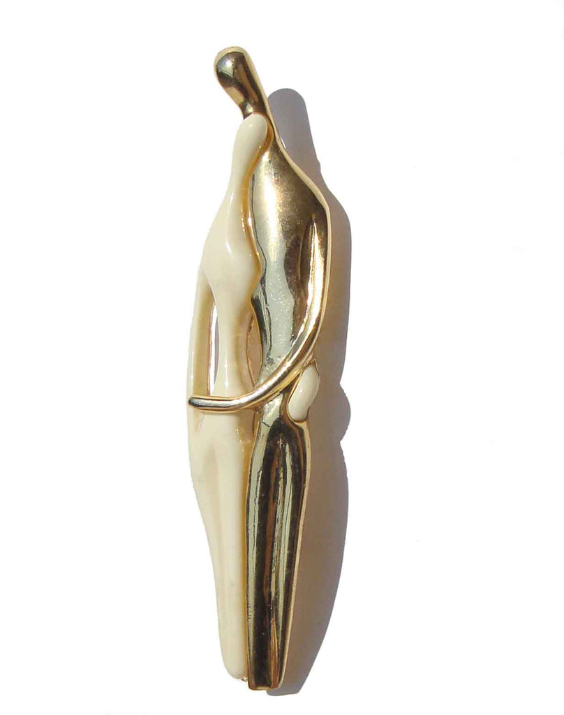 A modernist style couple hugs in an embrace, in this vintage brooch of gold and cream colored long limbed figures, circa 1990s.