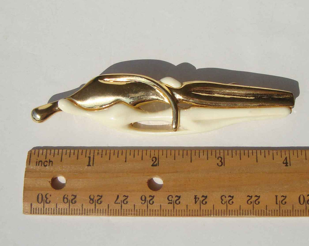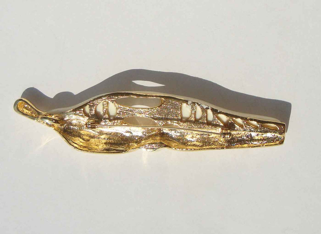 It is unsigned and measures approximately 4 inches long, has both a pinback and bail for use as a pendant if desired, and weighs 33.0 grams.