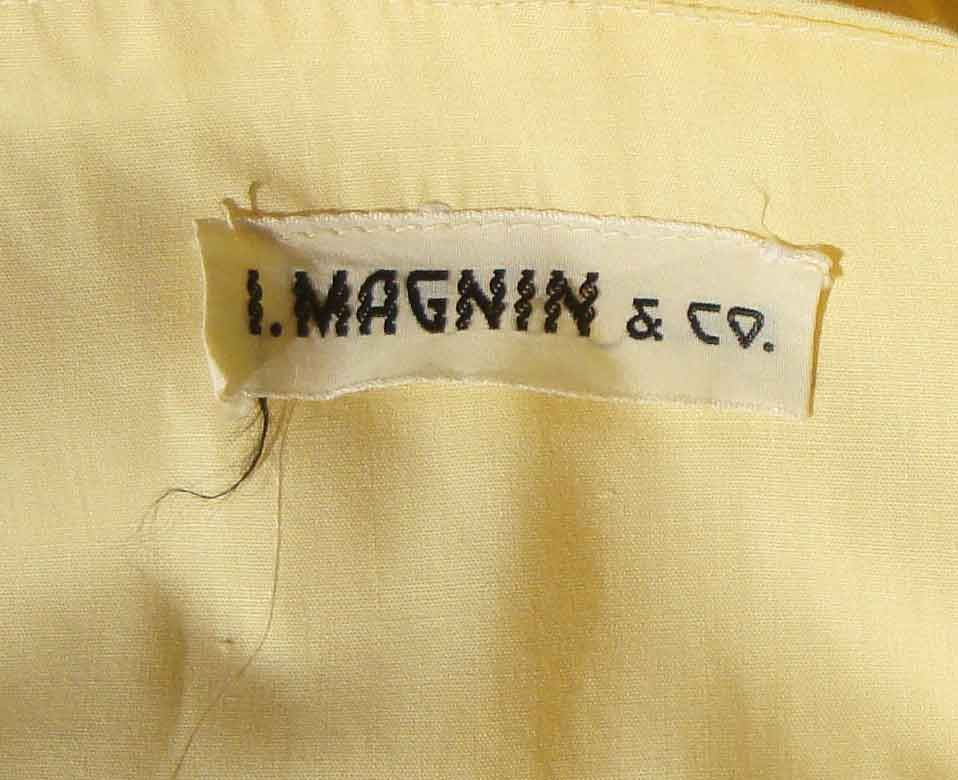 A bright buttercup yellow and blouson style bodice are features of this vintage summery shift dress from I. Magnin, circa 1950s.