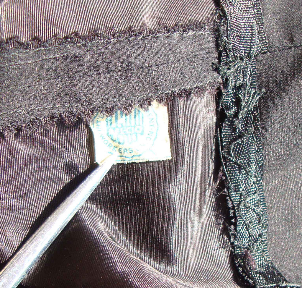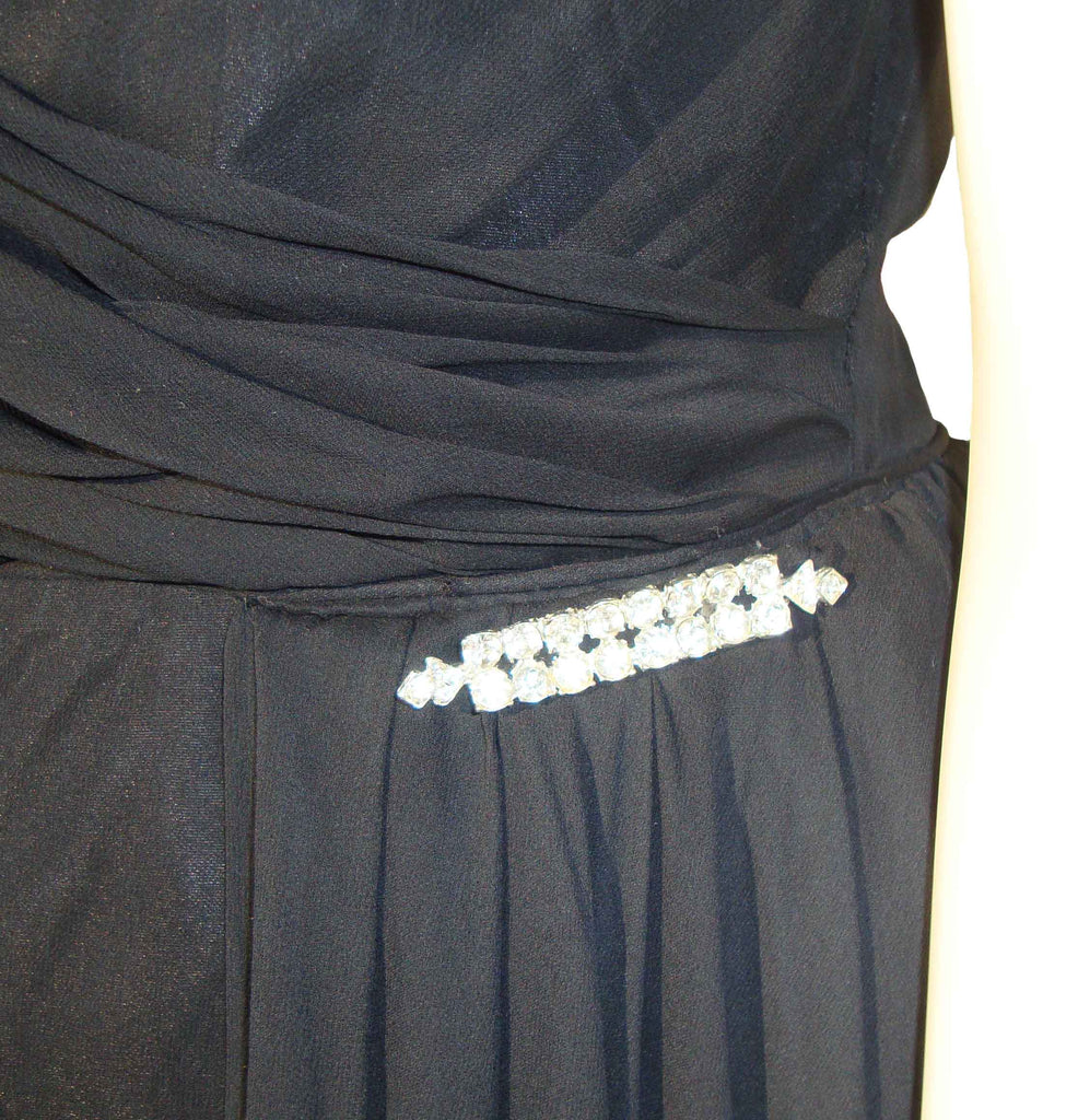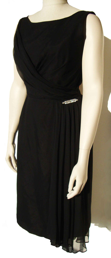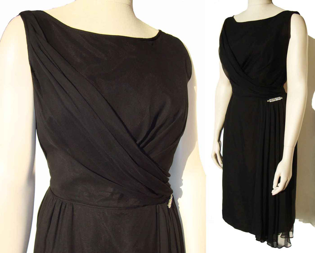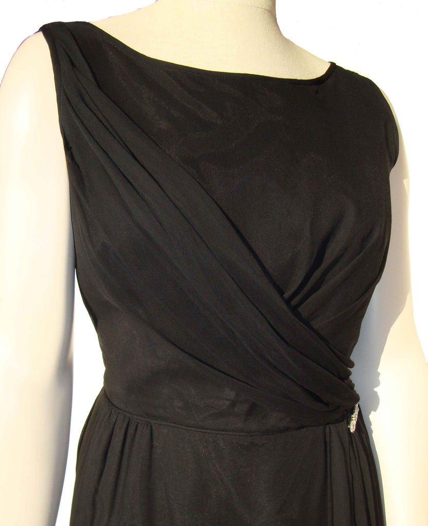 The sleeveless LBD consists of a black taffeta fabric with chiffon overlay, forming a Grecian style gathered bodice with flowing asymmetrical swag over the left waist, trimmed with a sparkling rhinestone bar pin. It also has a metal zippered back, and single blue and white ILGWU label within.