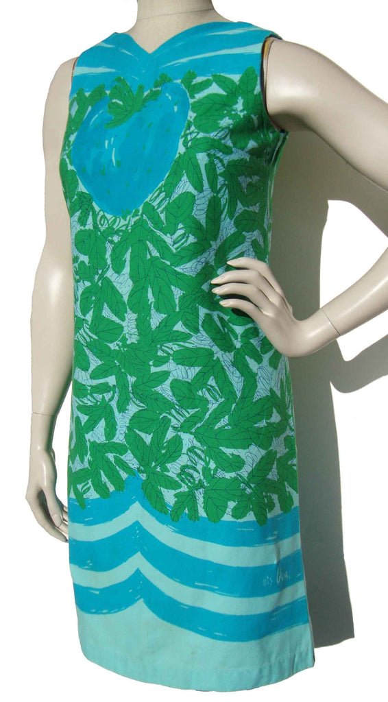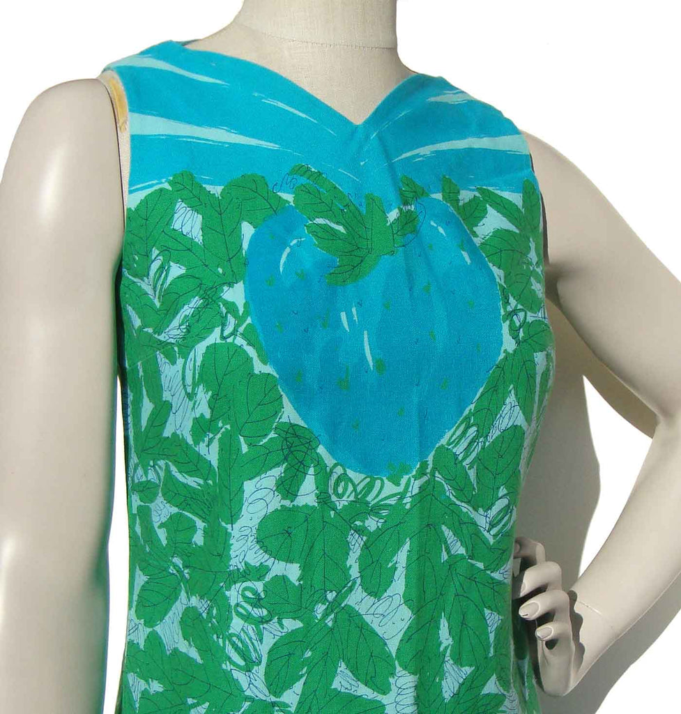 The sleeveless shift consists of a medium weight cotton with modernist screen print pattern comprising turquoise and pastel blue stripes along the shoulders and skirt, as well as a giant blue strawberry on the bodice, over a leafy green print.