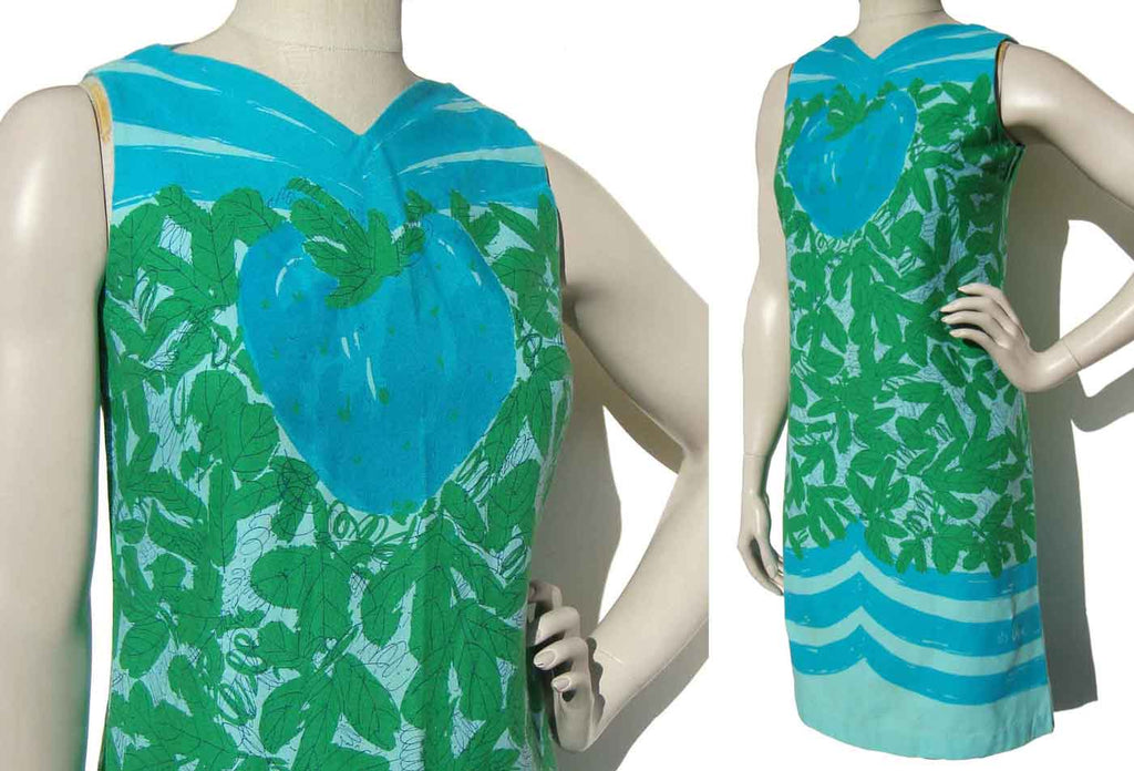 So cute and very mod, is this vintage novelty print summertime dress featuring a large blue strawberry over a green foliate design by Vera Neumann, circa 1960s
