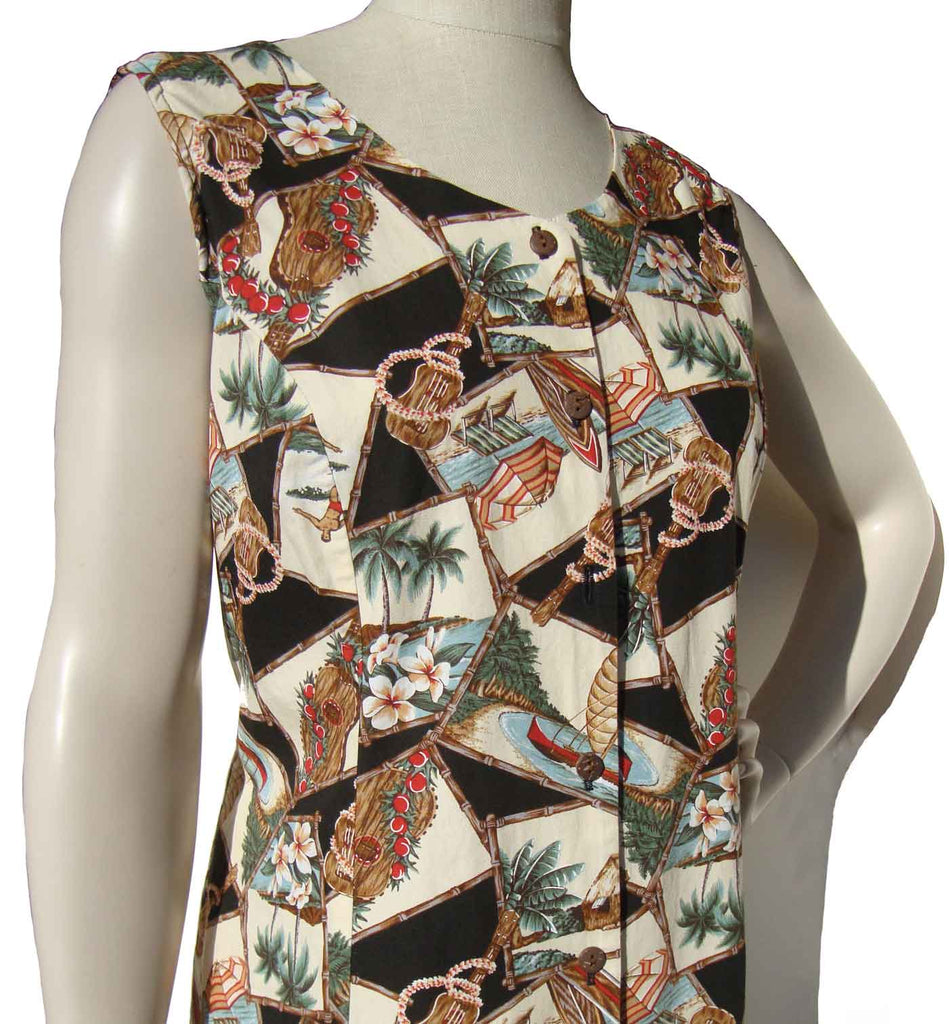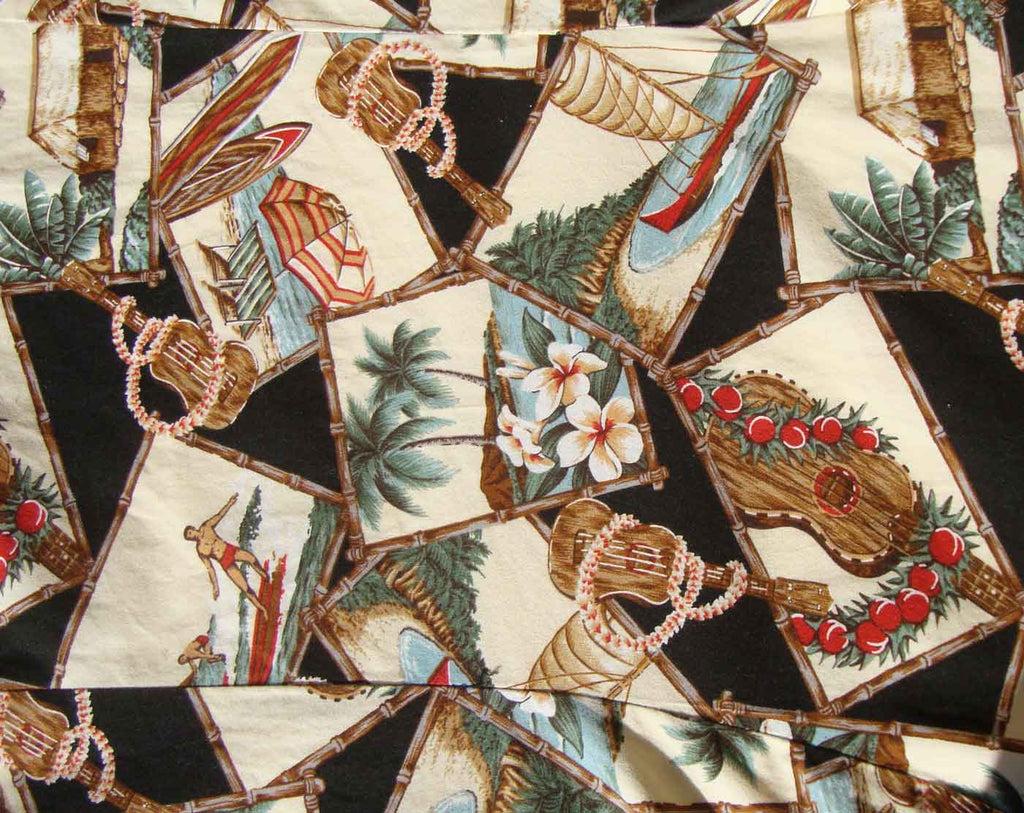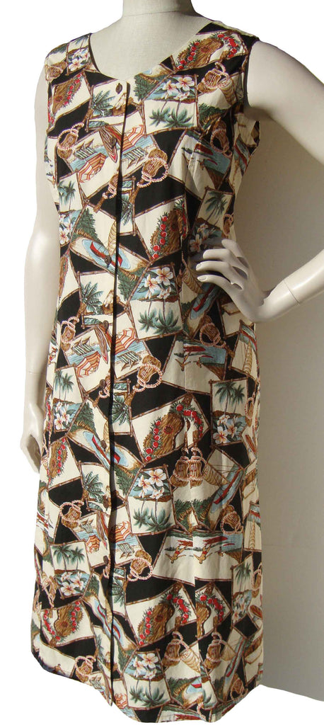 Classic scenes of Hawaii are featured on this vintage summery cotton dress with box print of surfing, ukuleles, beaches, outriggers, grass huts, frangipani flowers, leis, and palm trees in bamboo framed portraits, by Hilo Hattie, circa late 1990s early 2000s.