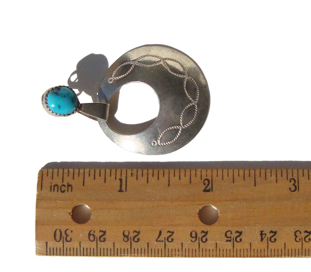 The swingy Southwestern earrings consist of unmarked sterling silver and feature doorknocker style domed hoops with decoratively stamped design, and genuine blue turquoise stones set in sawtooth bezels.