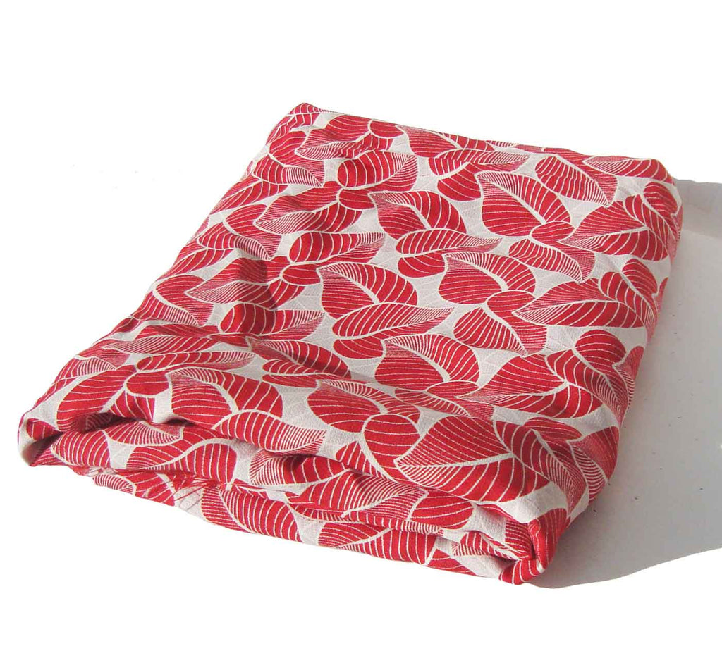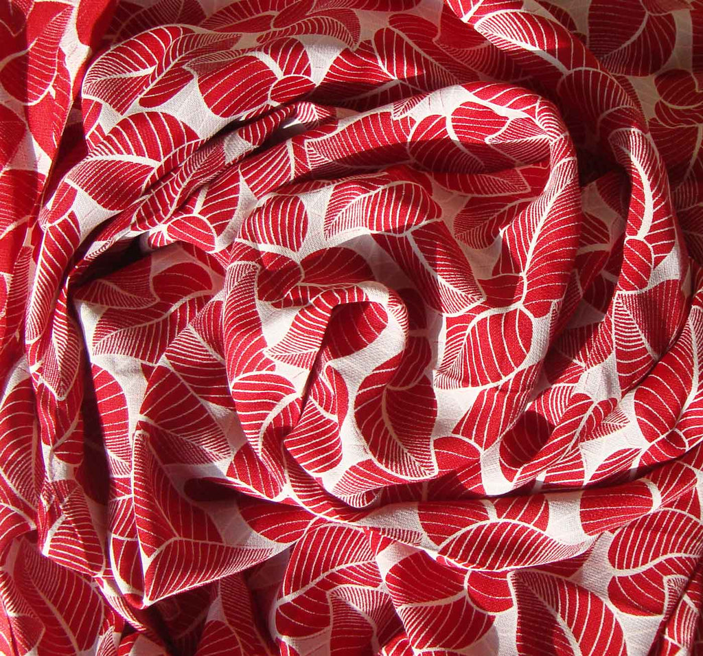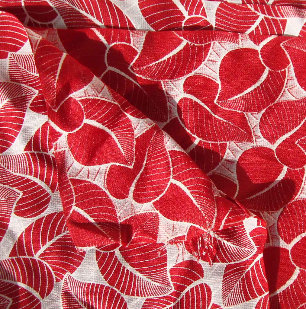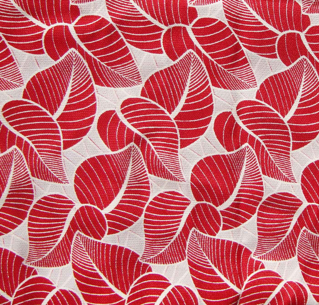 Bright red leaves create a foliate design in this luxurious vintage rayon damask fabric, with Art Deco styling, circa 1940s.