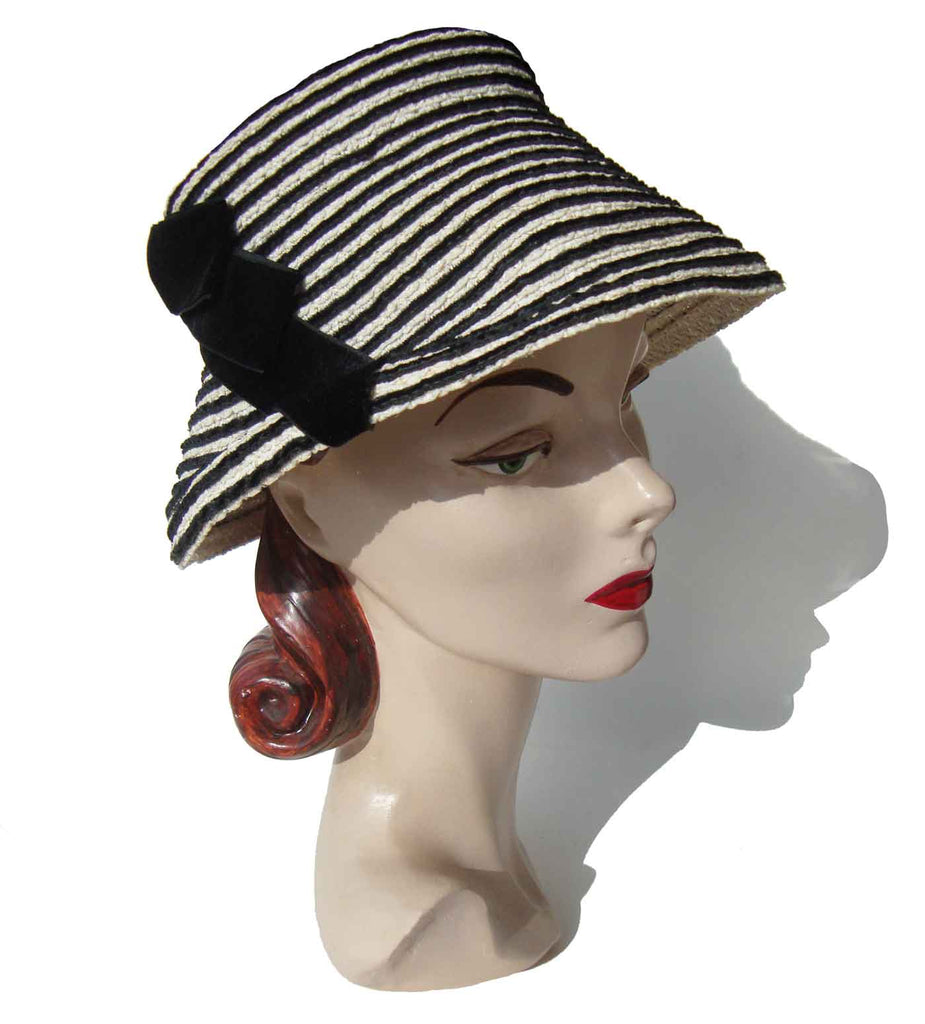 The bucket style hat or cloche consists of a softly woven cream colored raffia or straw with concentric black velvet ribbon trim and decorative velvet tie.