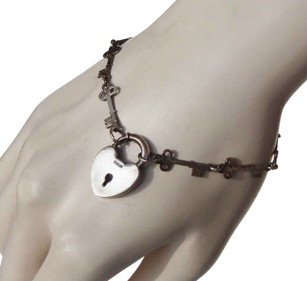 Unlock her heart, with this adorable vintage sterling silver heart bracelet with little heart shaped padlock charm, and chain links made from tiny skeleton keys, circa 1930s/40s.