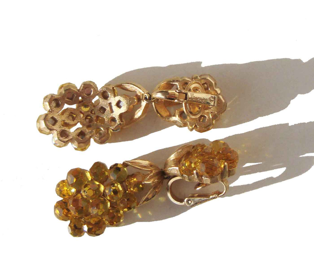 Bright topaz yellow crystal briolette beads capture the light, on this vintage pair of Crown Trifari grape cluster earrings, with swingy dangle style drops designed by Alfred Philippe, circa 1966.