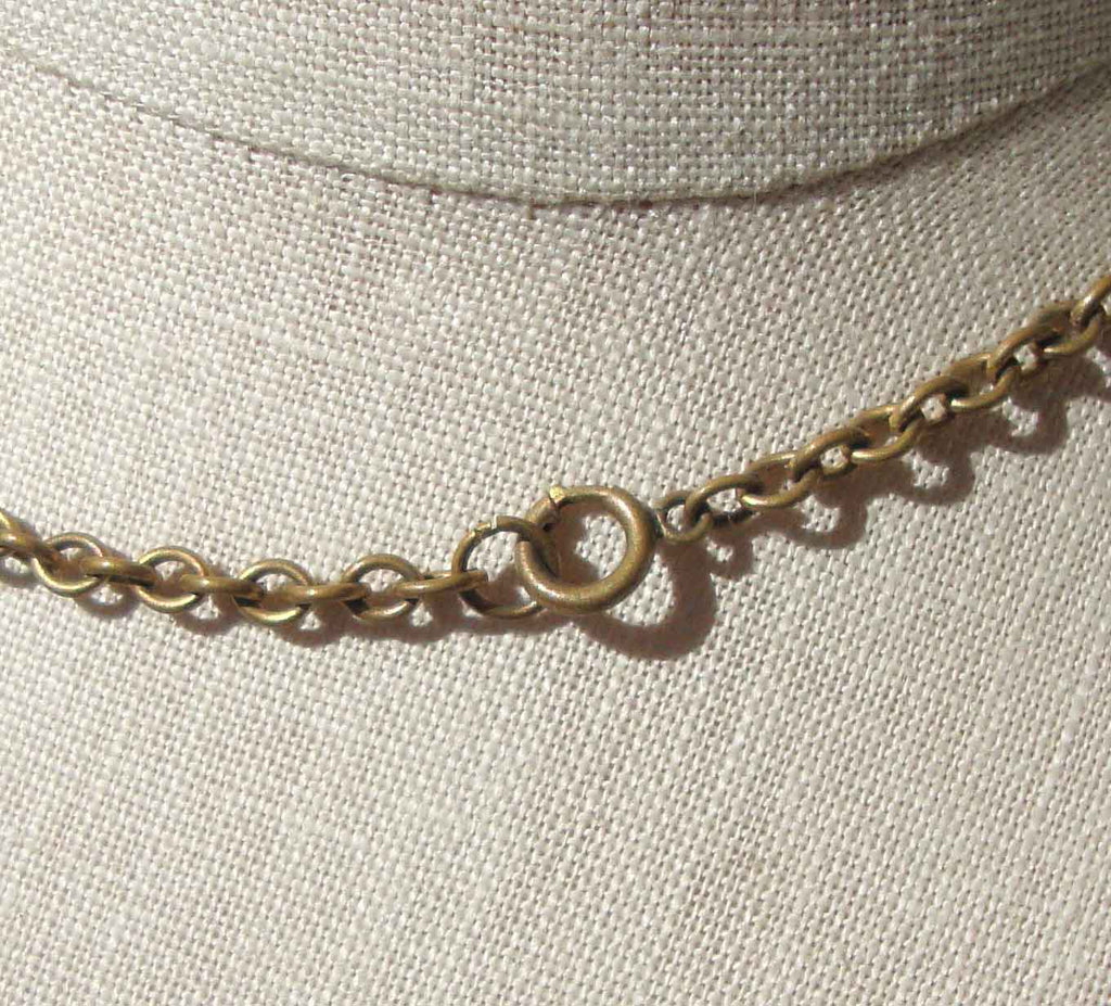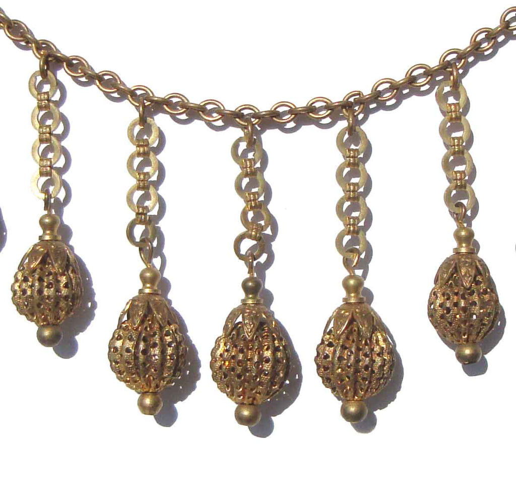 The articulated necklace is in the Egyptian Revival style, and consists of brass chain links with textured openwork brass drops, which sway with movement.