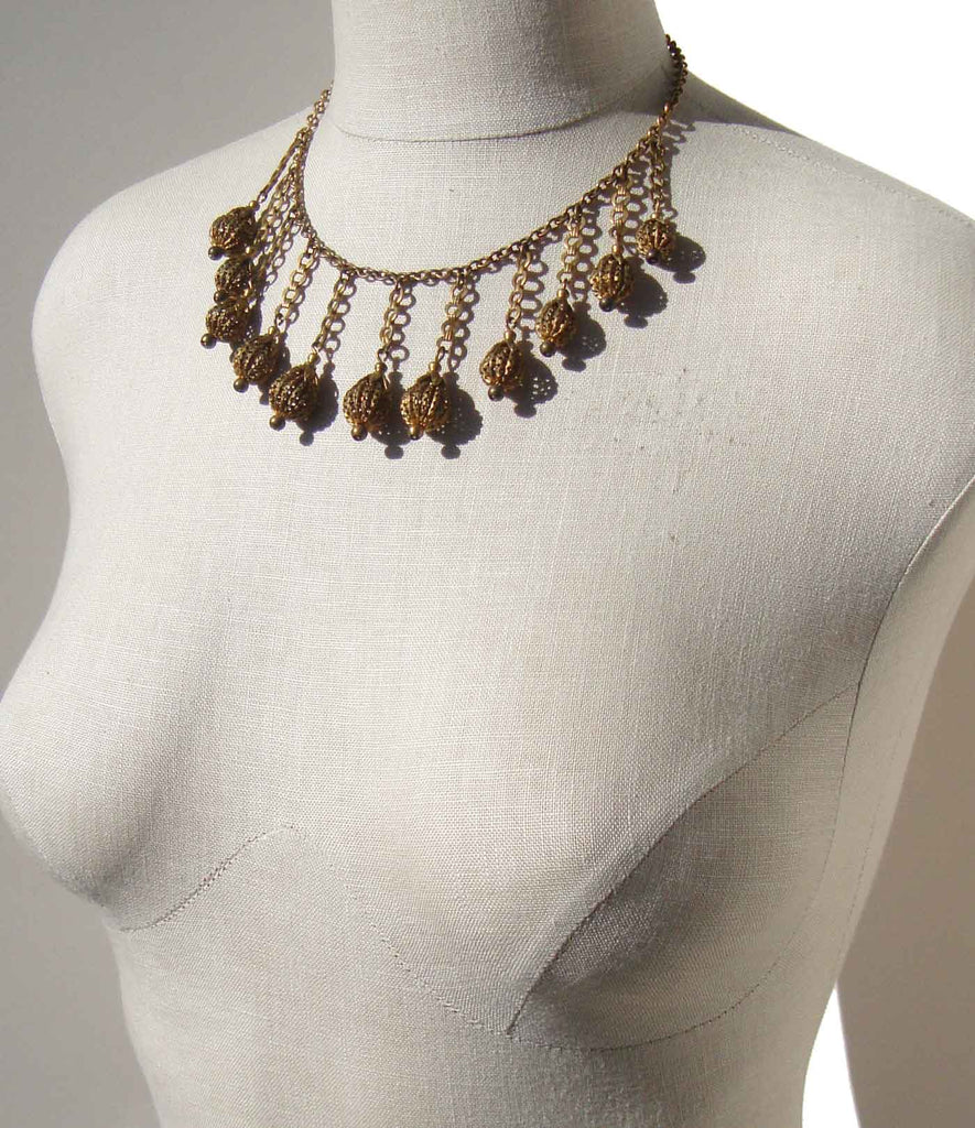 So Deco in design with a bow to Ancient Egypt, is this vintage Bohemian Czech fringed necklace, featuring drops of ornate brass beads, resembling hanging flower buds, circa 1930s.