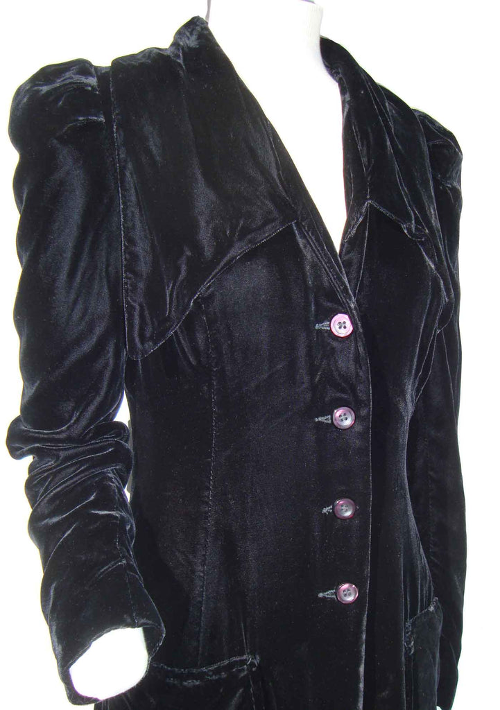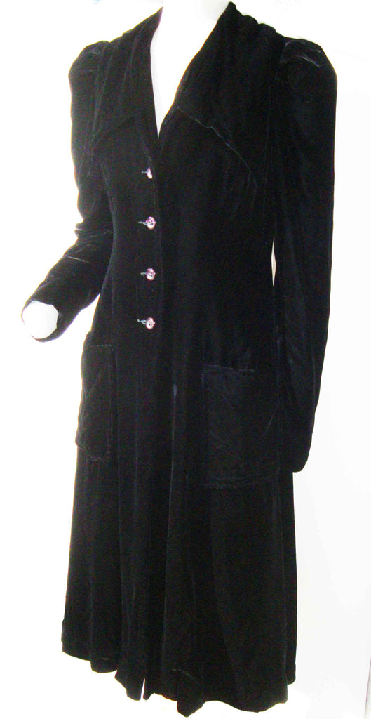 The unlabeled Art Deco coat has a fitted silhouette and consists of a soft black velvet fabric, featuring a V collar with wide pointed lapels, long sleeves with puffed shoulders, button down closure, and two patch pockets at the hips.