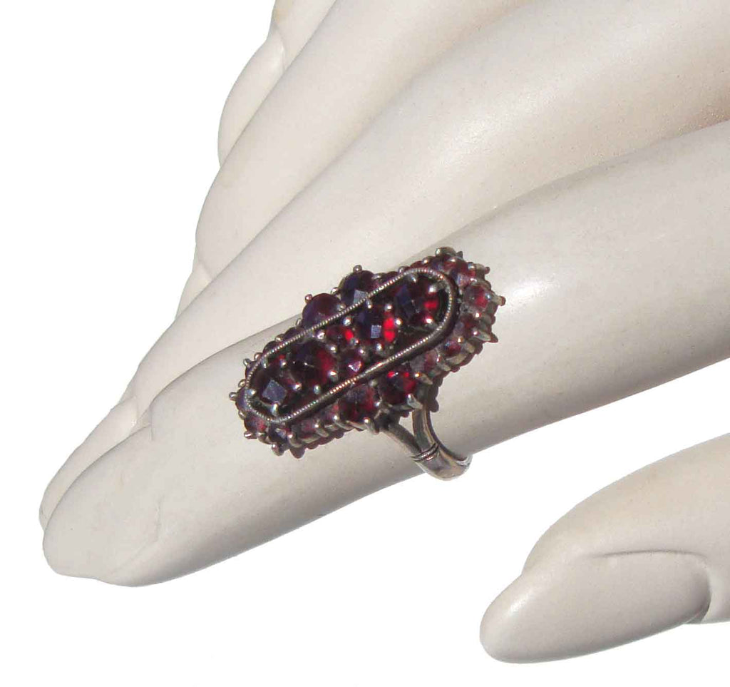 The antique ring consists of 900 silver (just under Sterling) and has an oblong shape, prong set with rose cut faceted Bohemian garnet gemstones with deep red color.