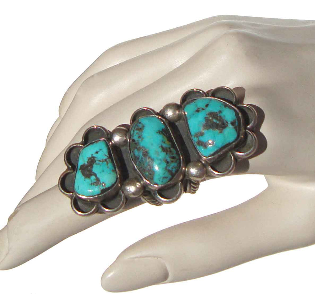 Three large and vivid stones of Kingman turquoise are featured on this vintage statement ring by JLC for Chimney Butter, also known as Eric Chase Nelson.