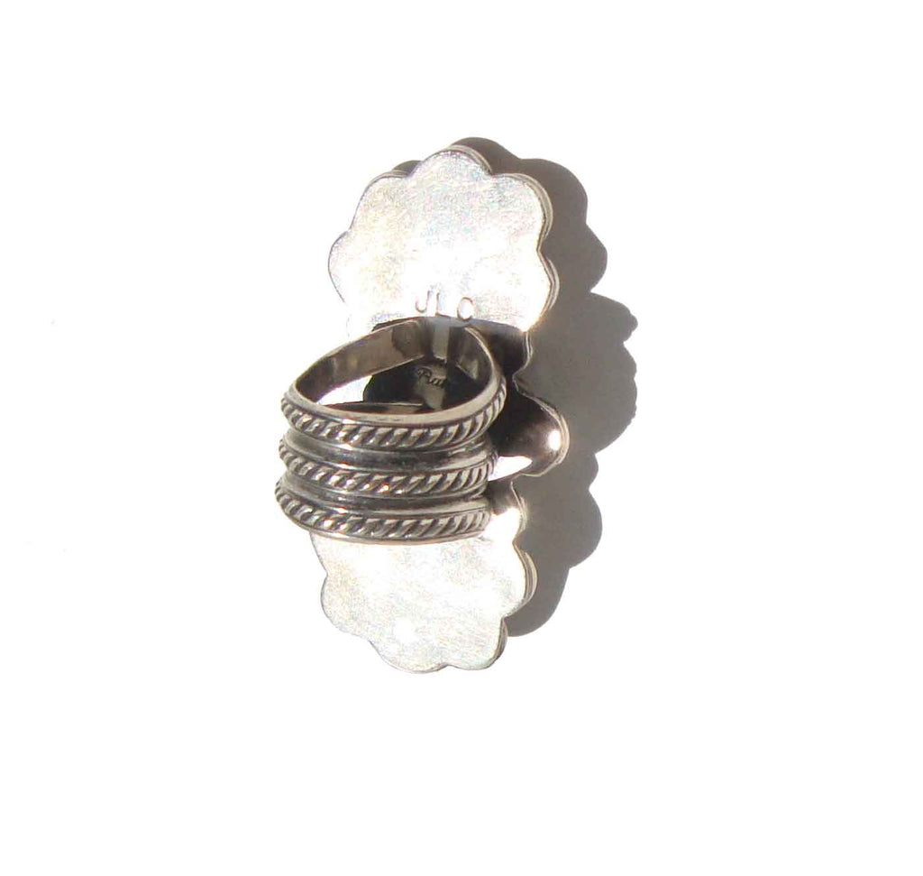 The face of the ring measures approximately 2&1/8 inches in length, measures a size 8 on my ring mandrel, weighs 30.1 grams, and is marked “JLC” with “Sterling Silver” and “Chimney Butter” partially obscured by the shank.