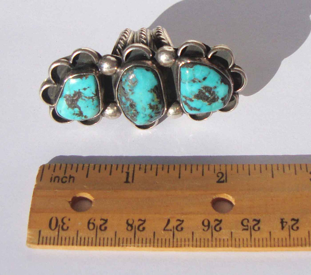 The finely hand crafted Navajo ring consists of sterling silver with decorative triple shank as shown, bezel set with three handsomely sized blue turquoise gemstones, along with scalloped borders and silver beading.