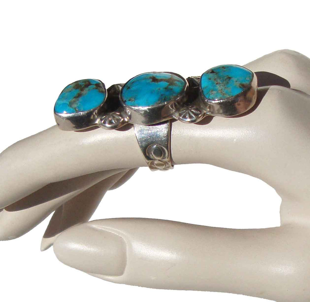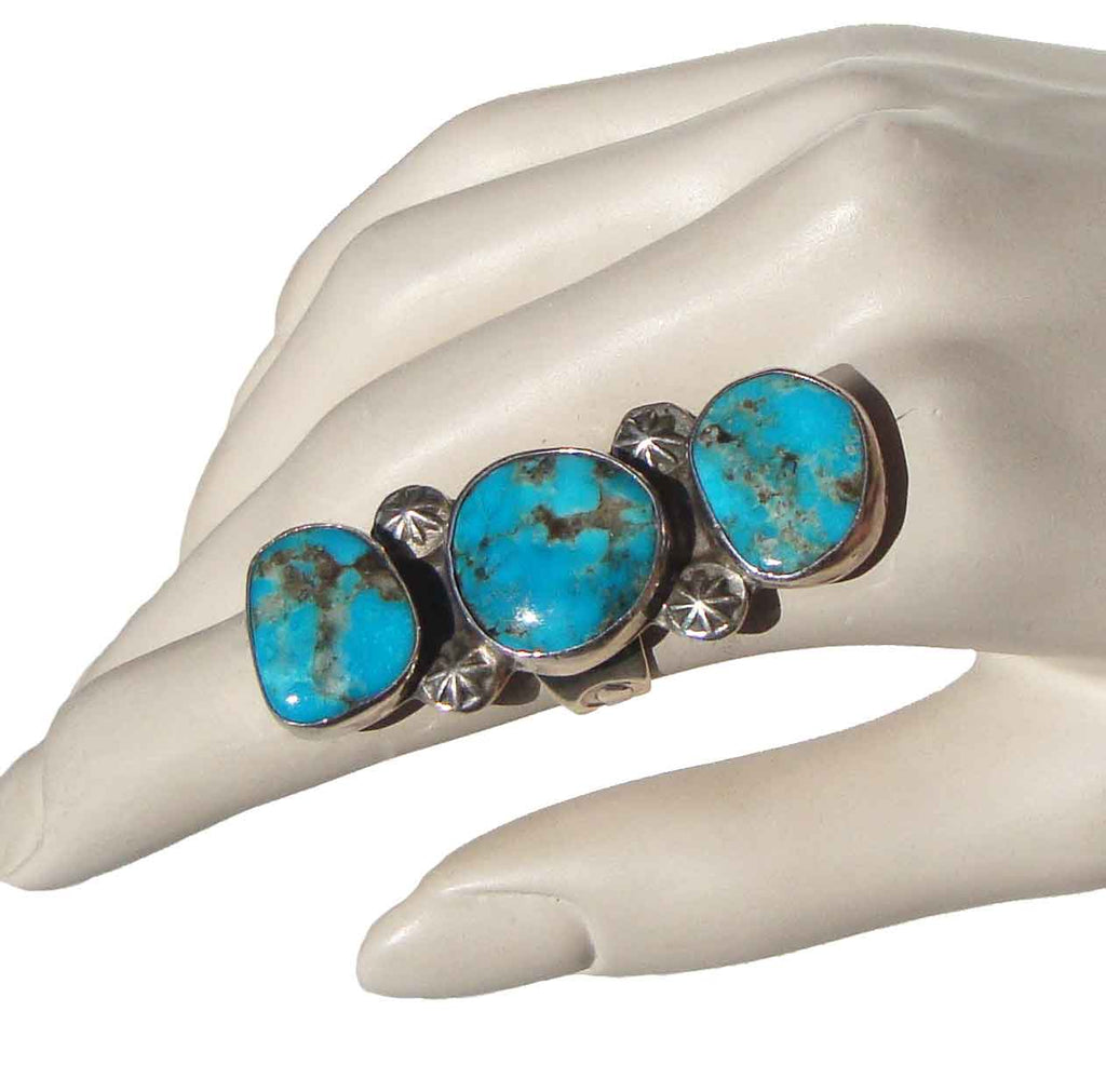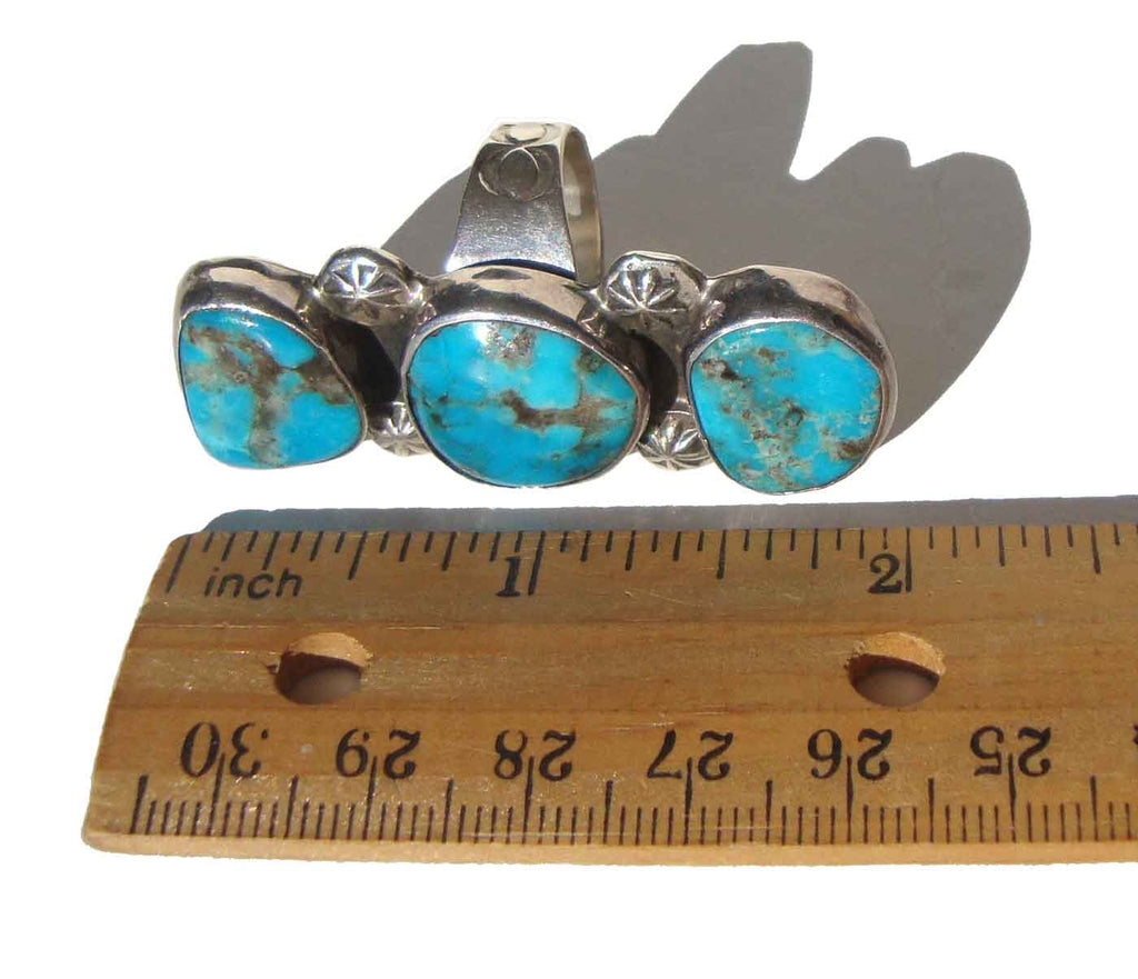 So bright and bold! Are the three Kingman turquoise gemstones on this vintage triple stone Native American ring by Chimney Butte (Eric Chase Nelson).