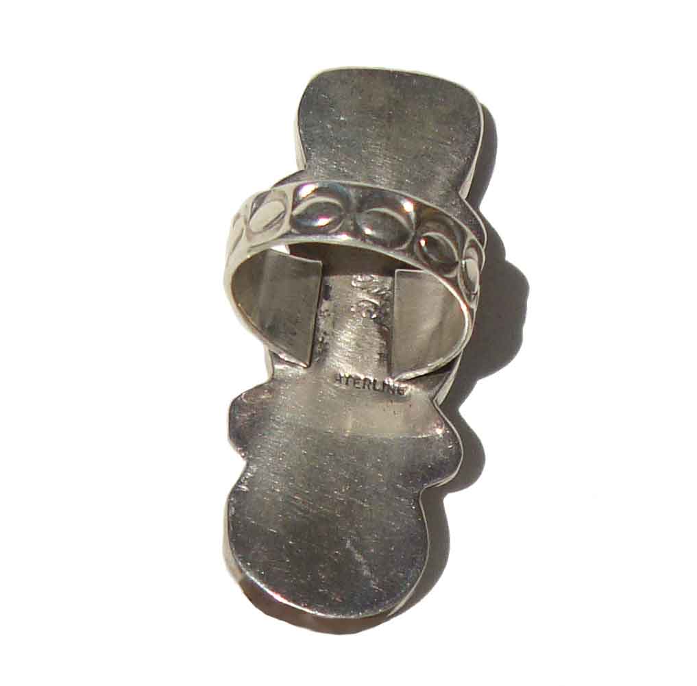 It measures approximately 2 inches in length, measures a size of 7&3/4 on my ring mandrel, weighs 16.1 grams, and is signed “Chimney Butte” and “Sterling”.