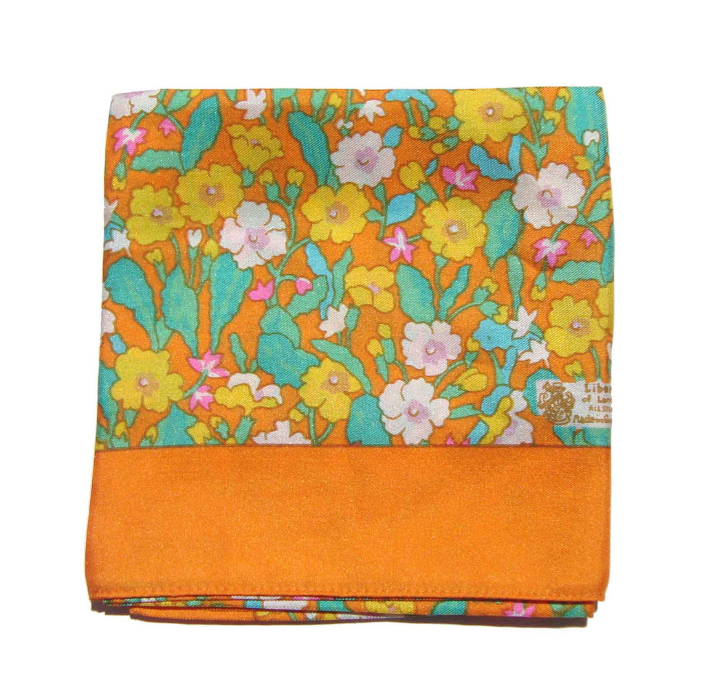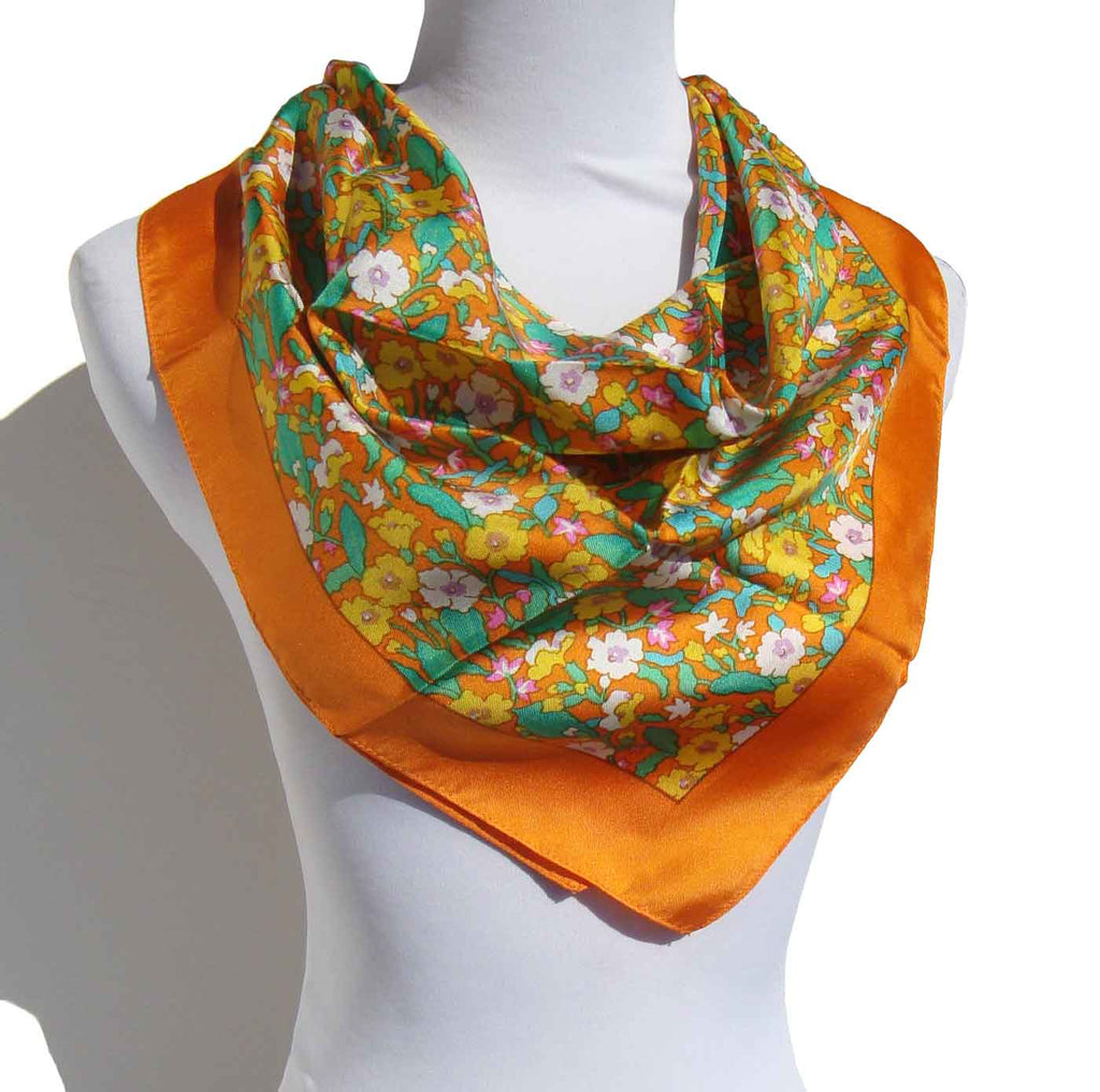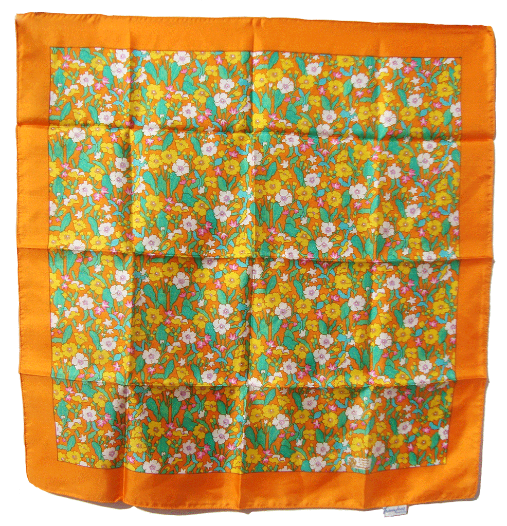 The square shaped scarf and kerchief appears to have never been worn, and consists of a fine silk twill with petite flower print in colors of yellow, white, pink, and green, surrounded by a bright orange border.
