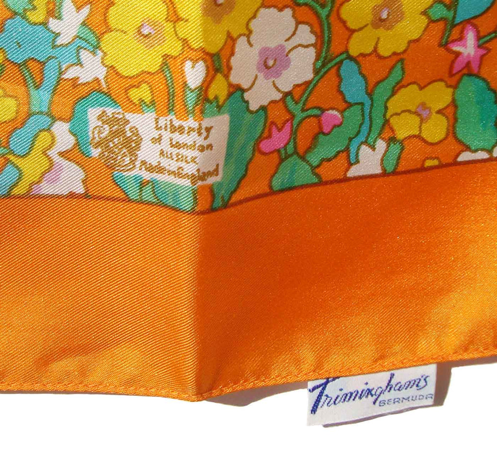 It measures approximately 23 x 23 inches square, and is signed “Liberty of London” with logo, “All Silk” and “Made in England”, and has an embroidered label for “Trimingham’s”, “Bermuda”.