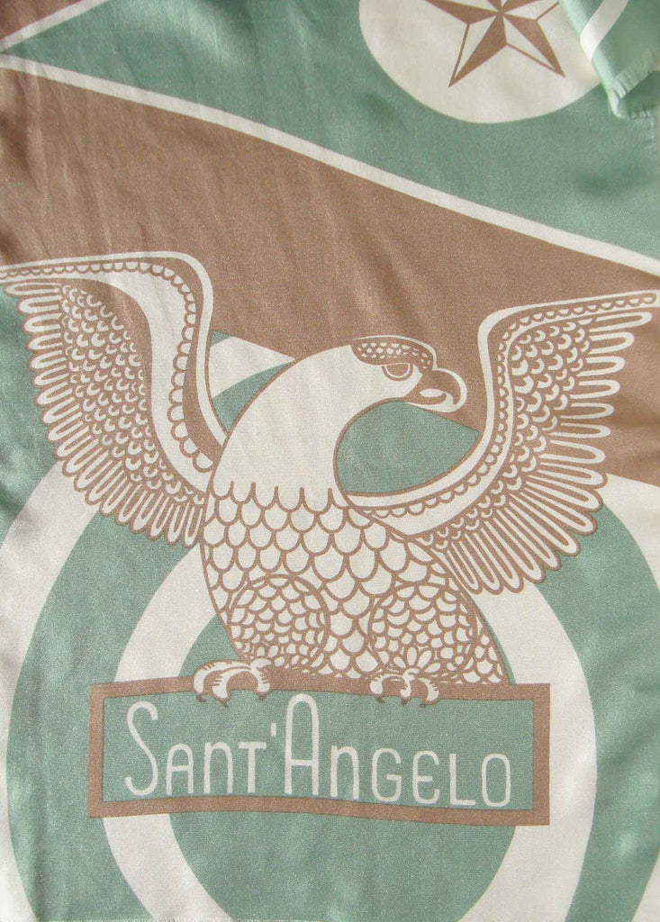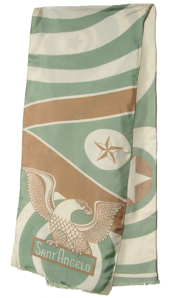 A majestic eagle with spread wings along with geometric lines and stars, is featured on this vintage modernist green and fawn silk scarf by Sant’Angelo, circa 1960s.