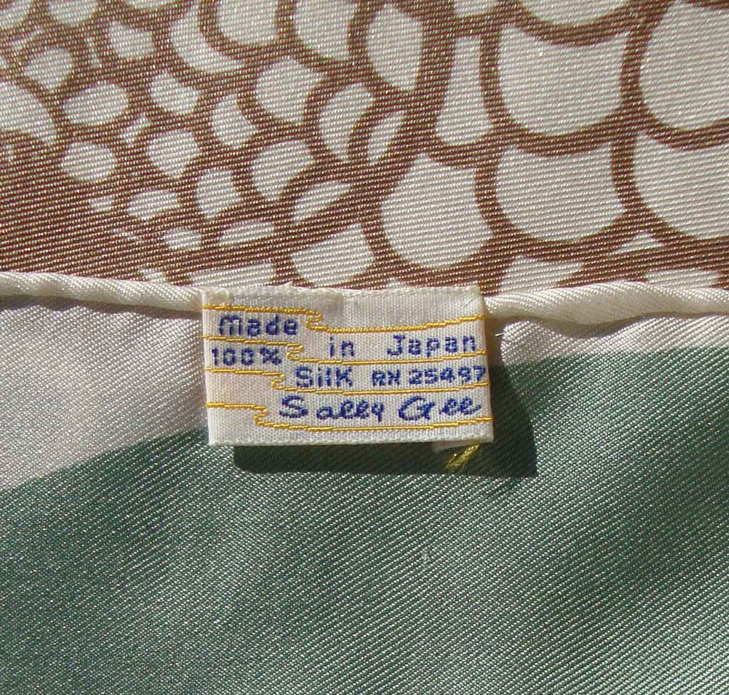 It also has hand rolled and stitched hems, measures approximately 14 inches wide by 70 inches in length, is signed “Sant’Angelo” on the scarf, and has an embroidered label for “100% Silk”, “Made in Japan”, registration number, and “Sally Gee”.