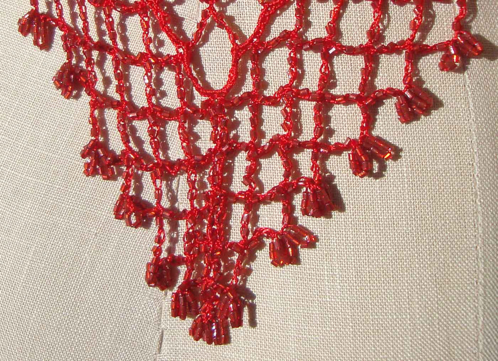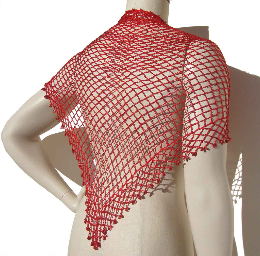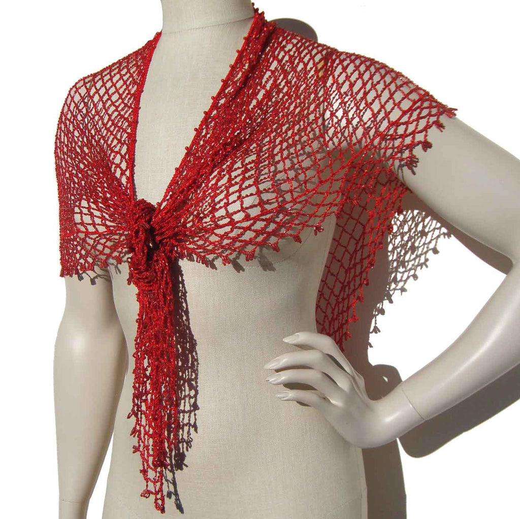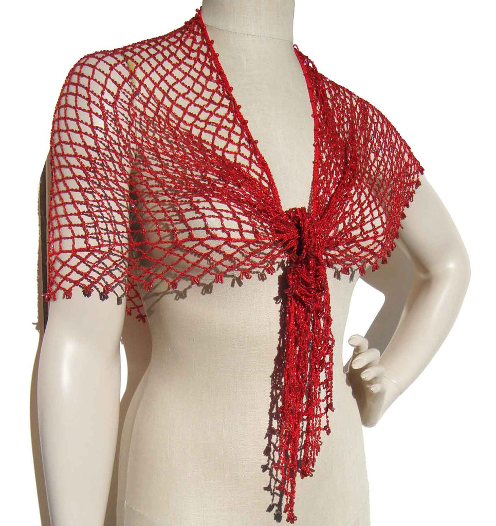 The fanciful wrap is in the form of a large sized rectangular scarf, and consists of an openwork crochet, trimmed with semi-translucent red glass bugle beads.