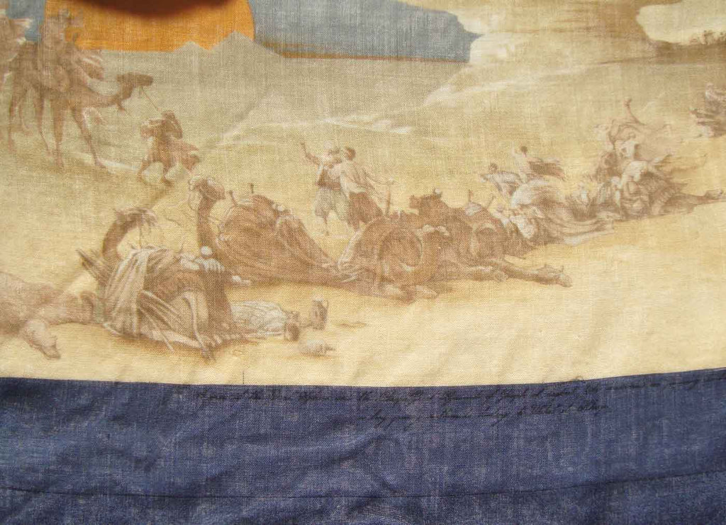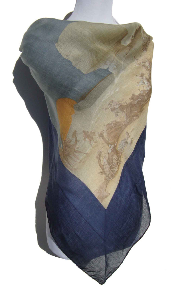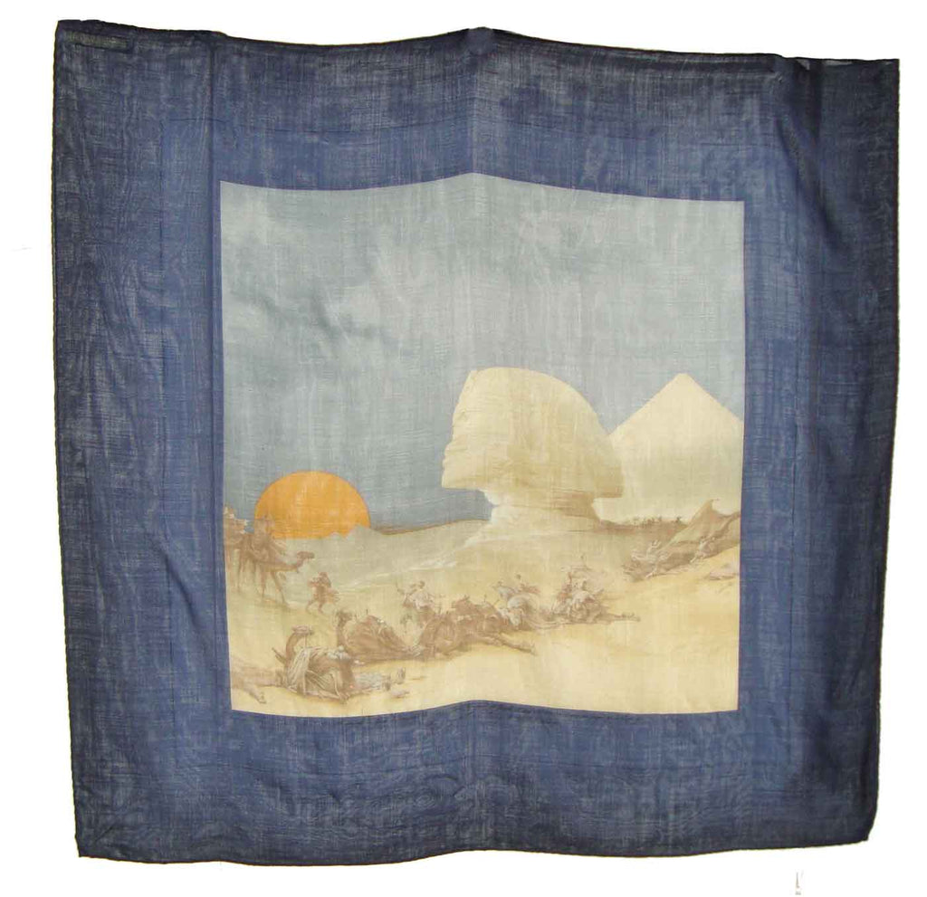 The scenic mid-weight scarf consists of a silk and wool gauze, with scenic desert print of the Sphinx, pyramid of Khufu, rising sun, and camel caravan and battle in the foreground, in muted tones of sandy beige, brown, pale blue teal, and cantaloupe, along with a navy blue border.
