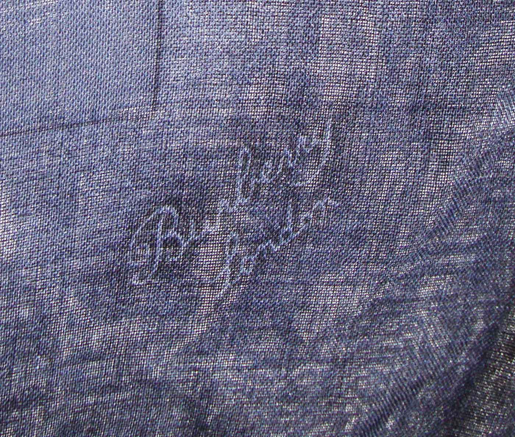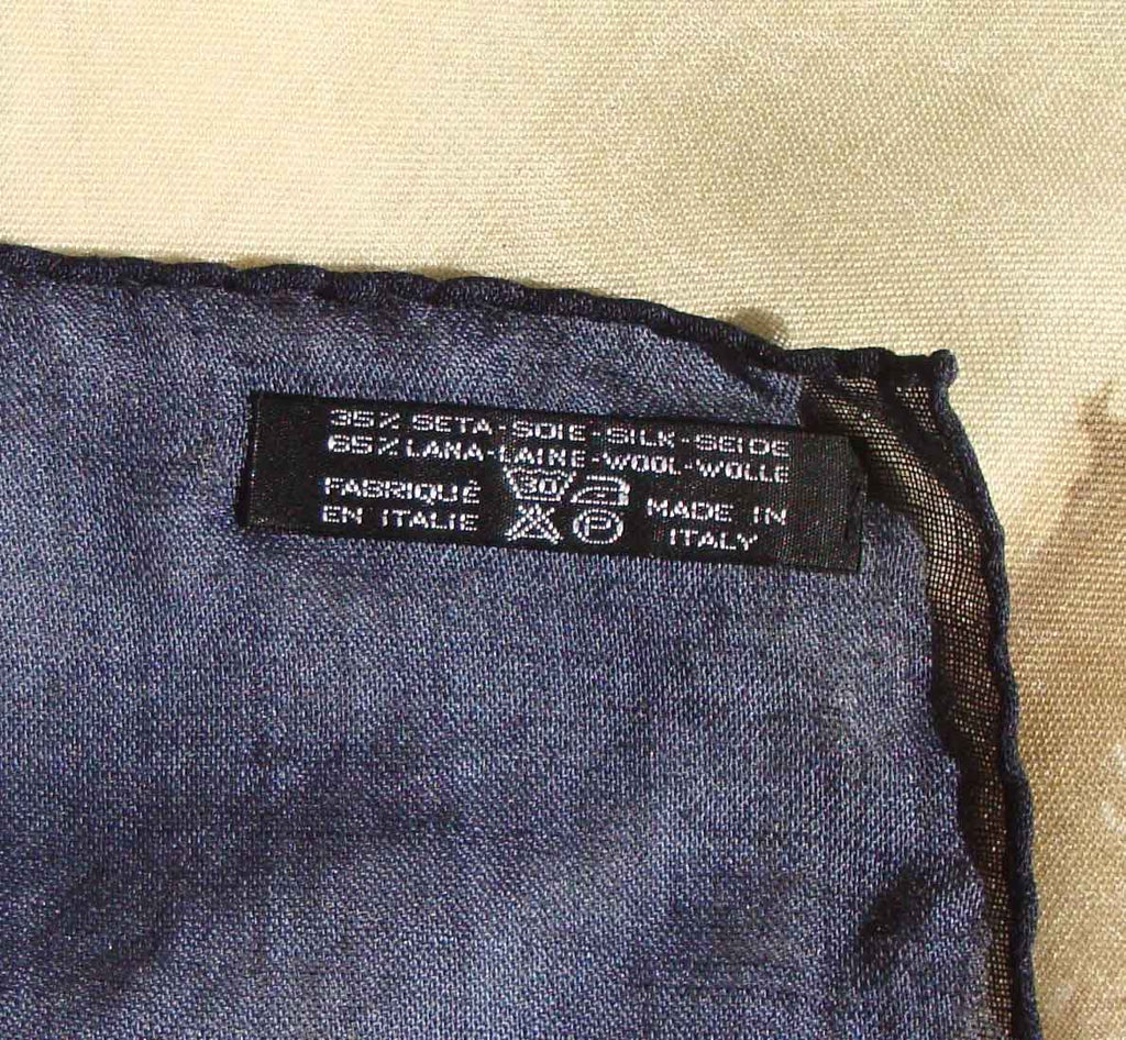 It measures approximately 33 inches square, has hand rolled and stitched hems, and is signed “Burberry” and “London” in one corner, and has a single embroidered label for “35% Silk 65% Wool”, “Made in Italy” and fabric care symbols.
