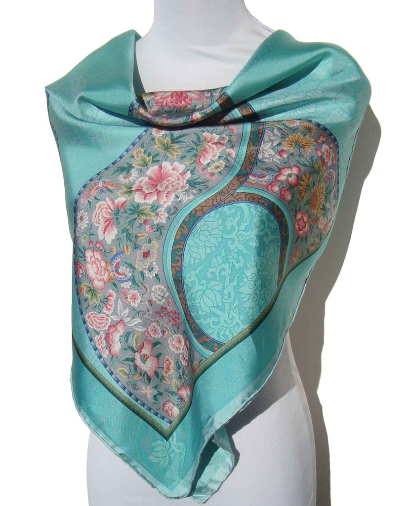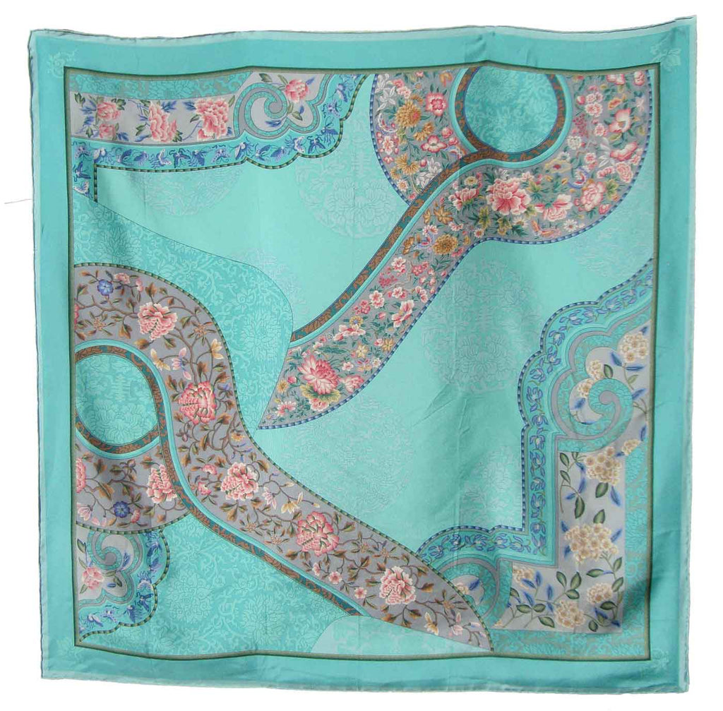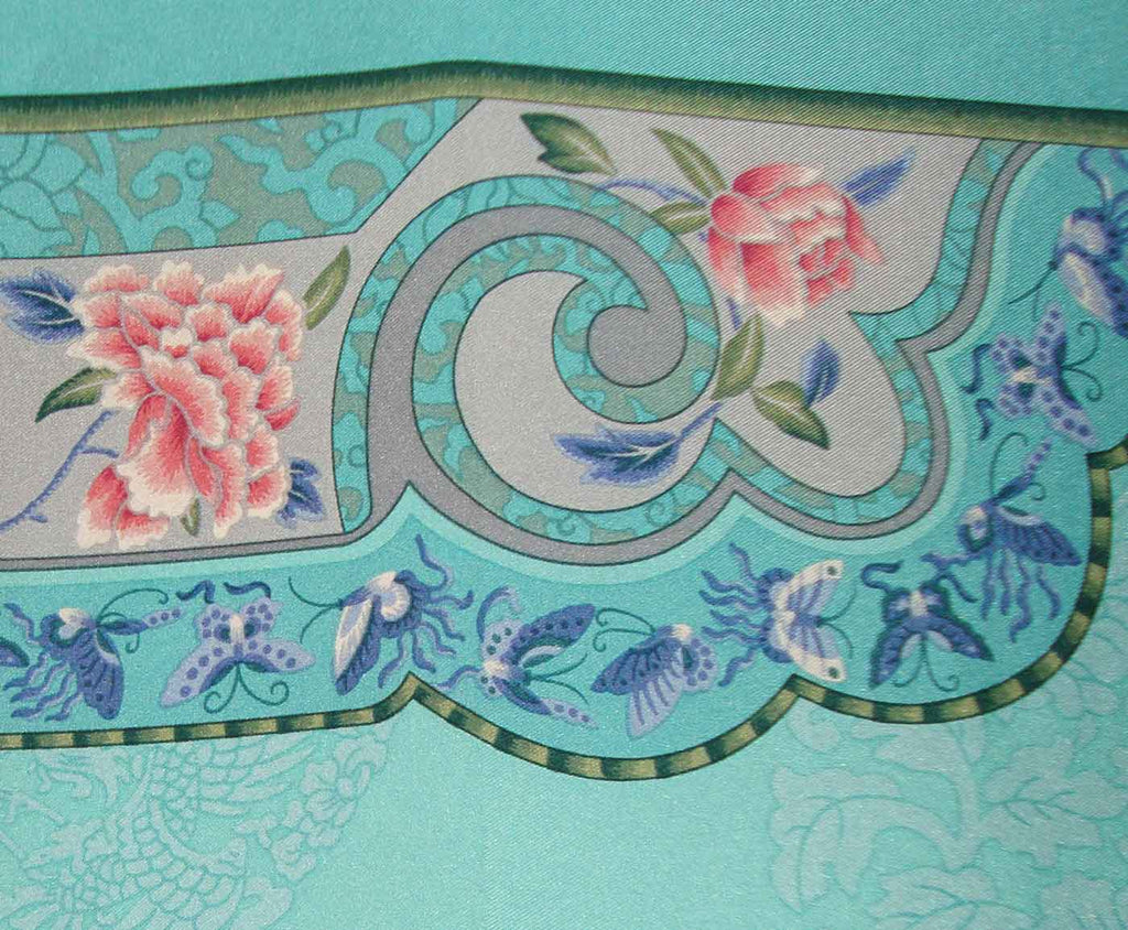 Delicate peony flowers, chrysanthemums, and fluttering butterflies are featured on this bright turquoise silk scarf with Chinese Qing Dynasty ‘cloud collar’ designs, circa 1980s/90s.