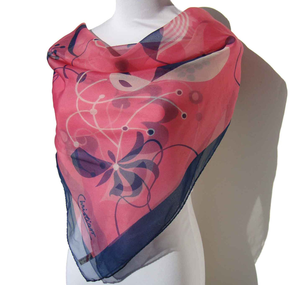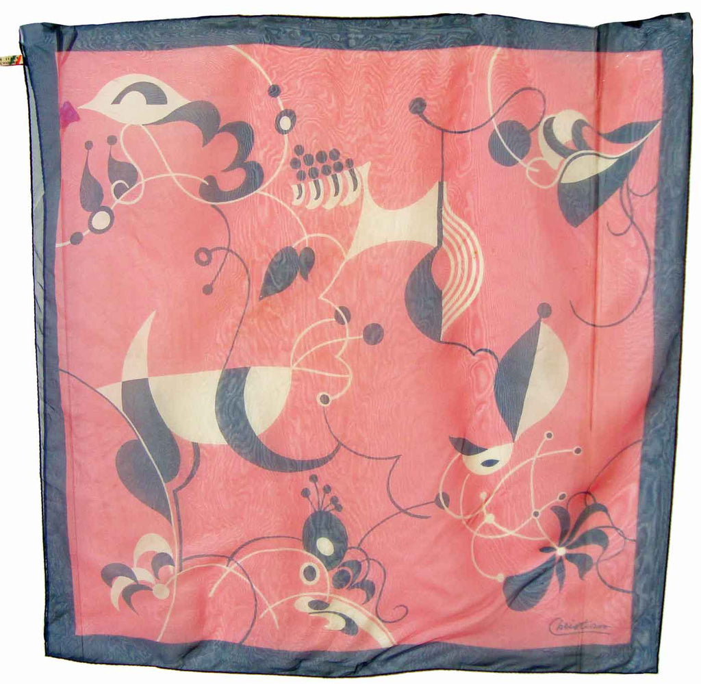 Modernist geometric shapes on a sheer pink chiffon, are featured on this vintage mid-century Italian scarf signed Christian, circa 1950s/60s.