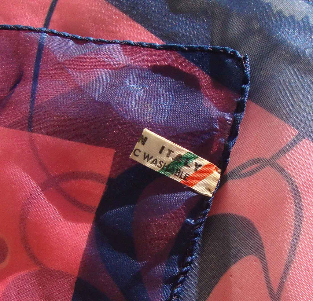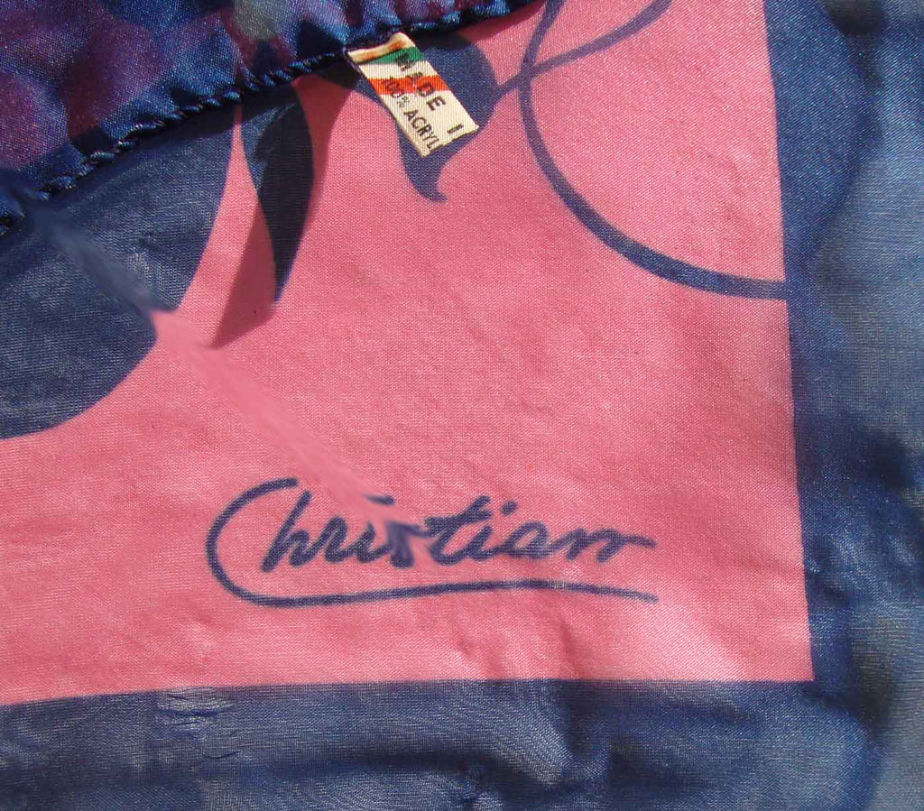 It also has hand rolled and stitched hems, measures approximately 30 inches in size, is signed “Christian” in one corner, and has a label for “Made in Italy”, “100% Acetate Washable”.