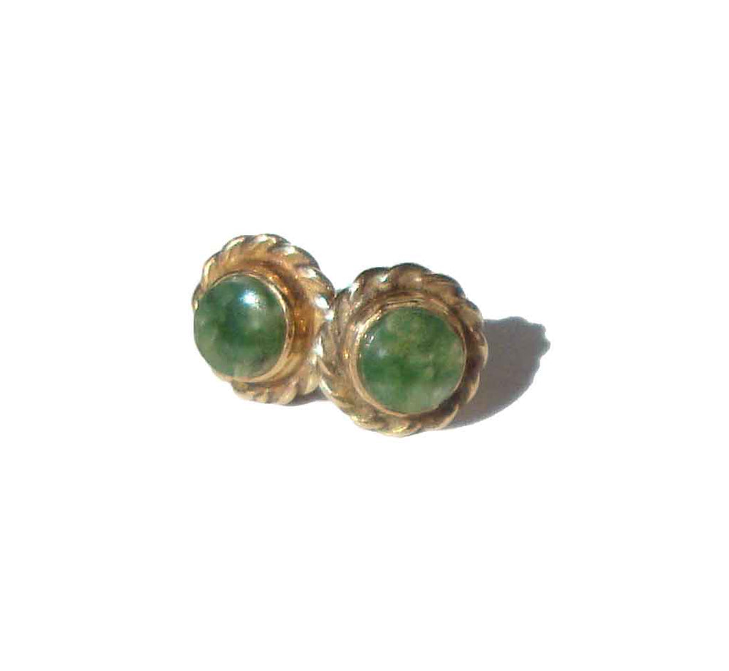Here’s a dainty pair of vintage gold stud earrings, with small green mottled jade cabs set in 14K yellow gold, circa 1960s.