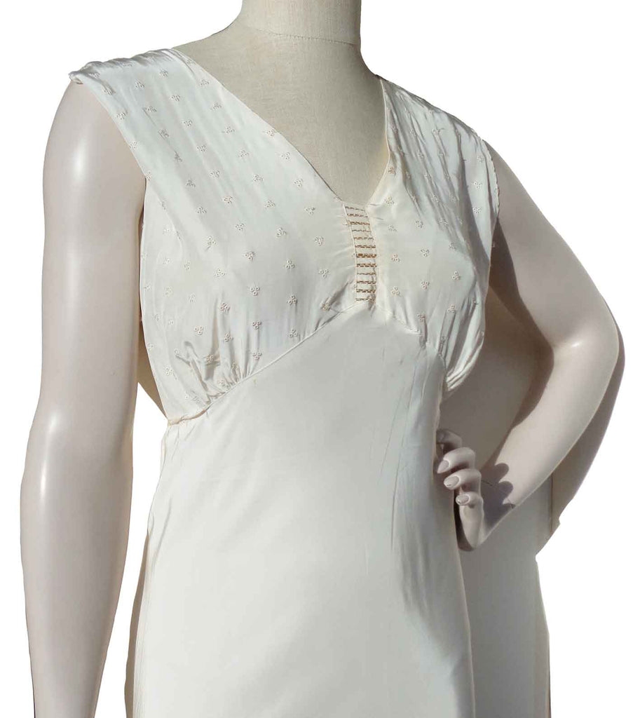 A creamy white liquid rayon with decorative bodice and lustrous surface, makes up this vintage luxurious full-length nightgown, with figure flattering silhouette, circa 1940s.