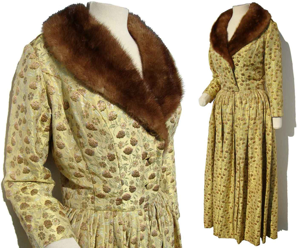 Vintage 50s Traina Norell Hostess Gown Strawberry Gold Brocade w/ Mink Collar S XS