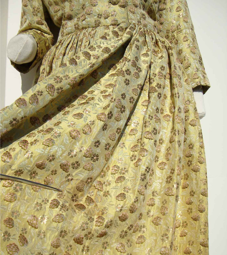 The heavy weight gown consists of a shiny yellow and metallic gold brocade, with quilted damask design of plump strawberry fruit and leafery, with mink shawl collar, and self covered buttons.