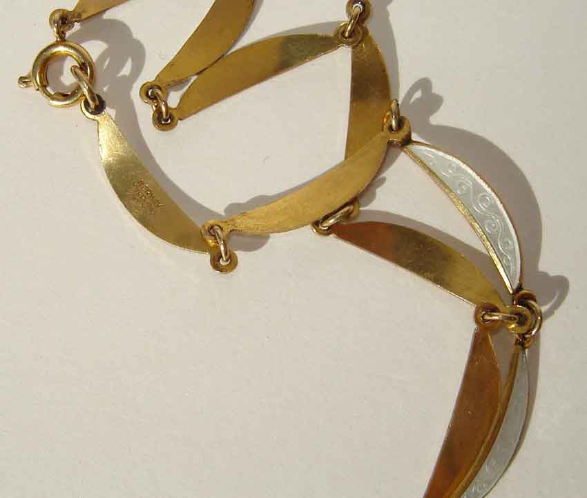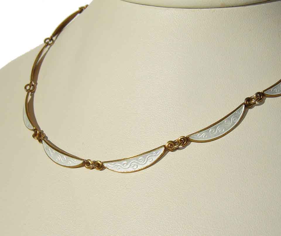The articulated light weight choker length necklace, consists of slender crescent shaped panels of sterling silver with gold vermeil, glazed in a white eggshell guilloché enamel with scrolled designwork and vitreous glass finish.
