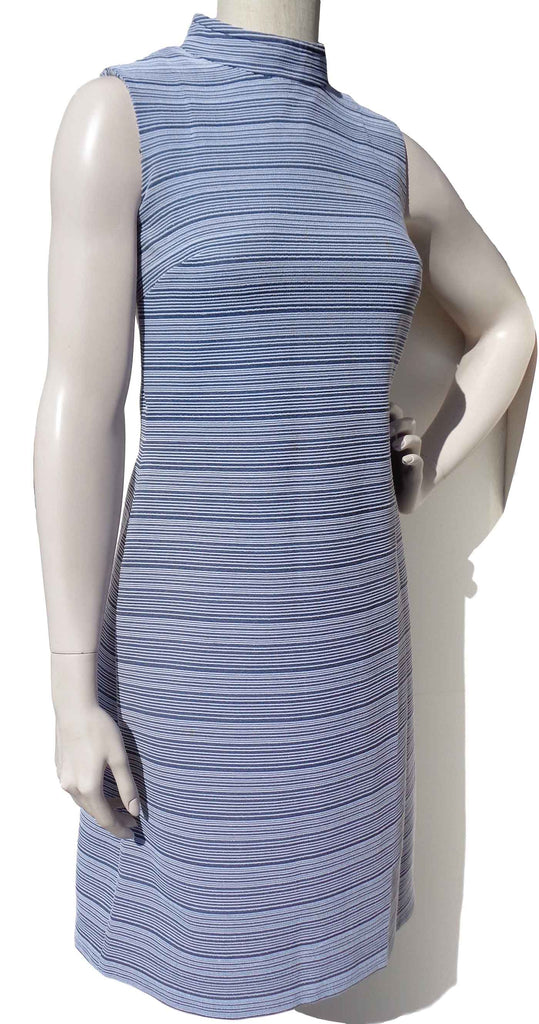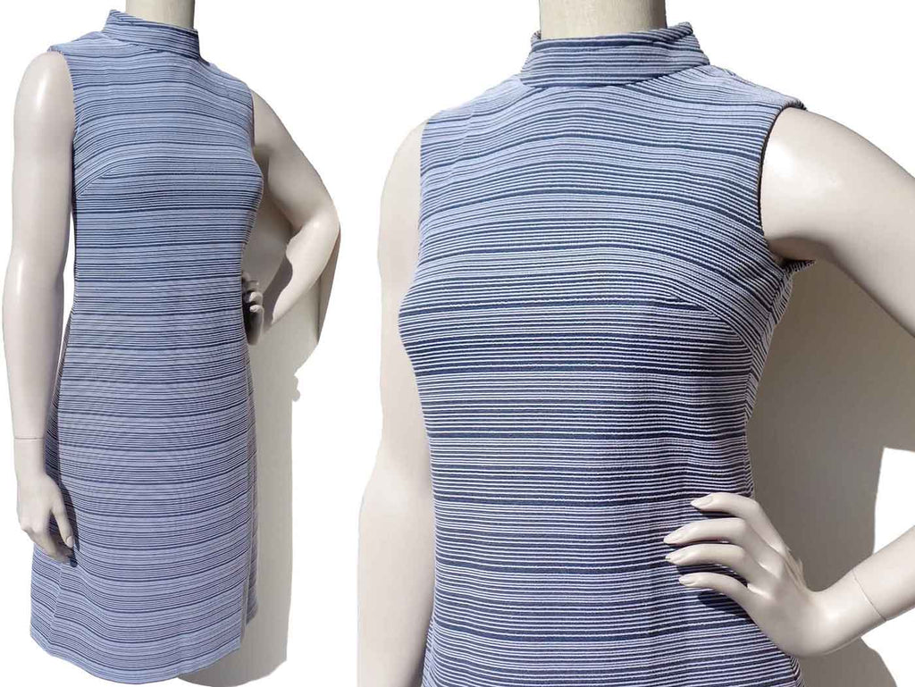 The sleeveless dress consists of synthetic knit, and has a navy blue ground with raised horizontal stripes, along with a mandarin collar, darted bust, zippered back, and a knee or below knee length.