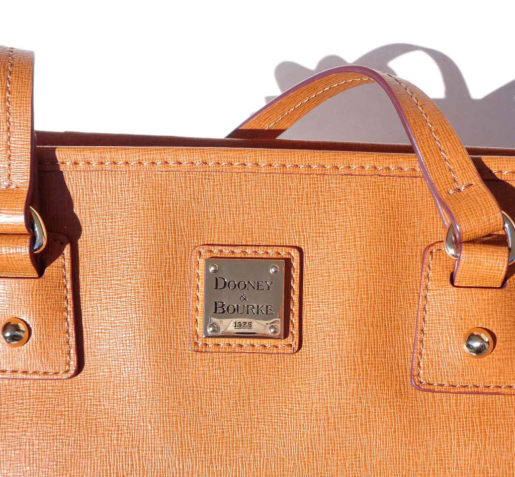 There is a metal name plate for “Dooney & Bourke 1975” on the exterior, a leather patch with script logo, the Dooney & Bourke cloth label with serial number on the reverse as shown, along with a ‘Made in China’ label.