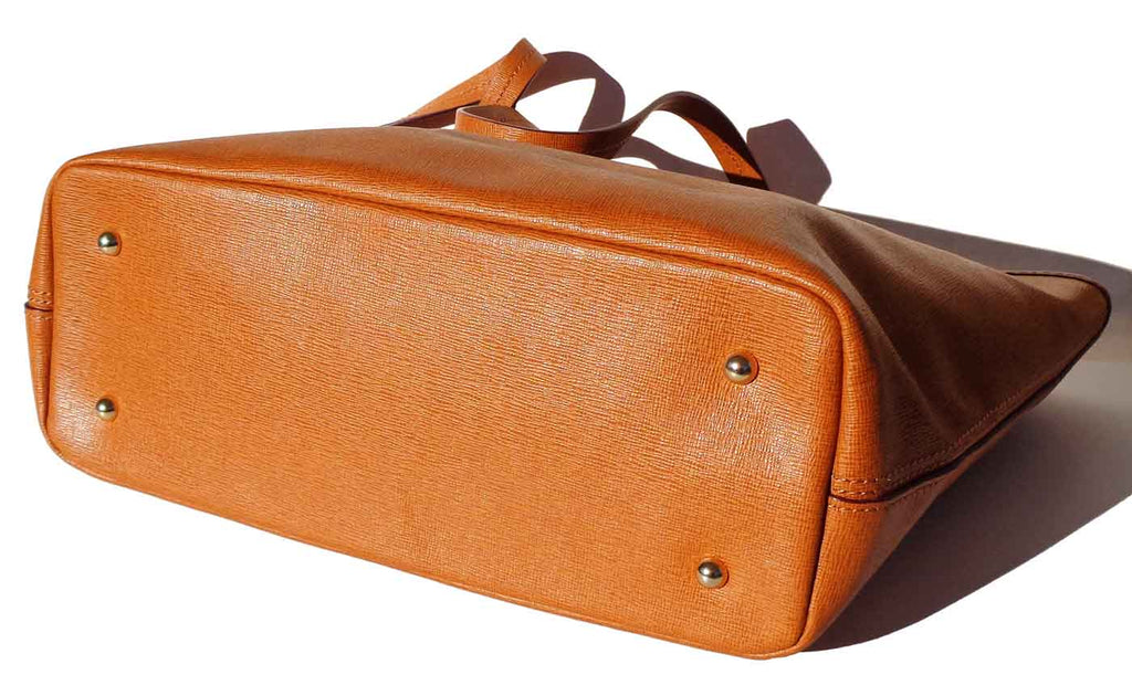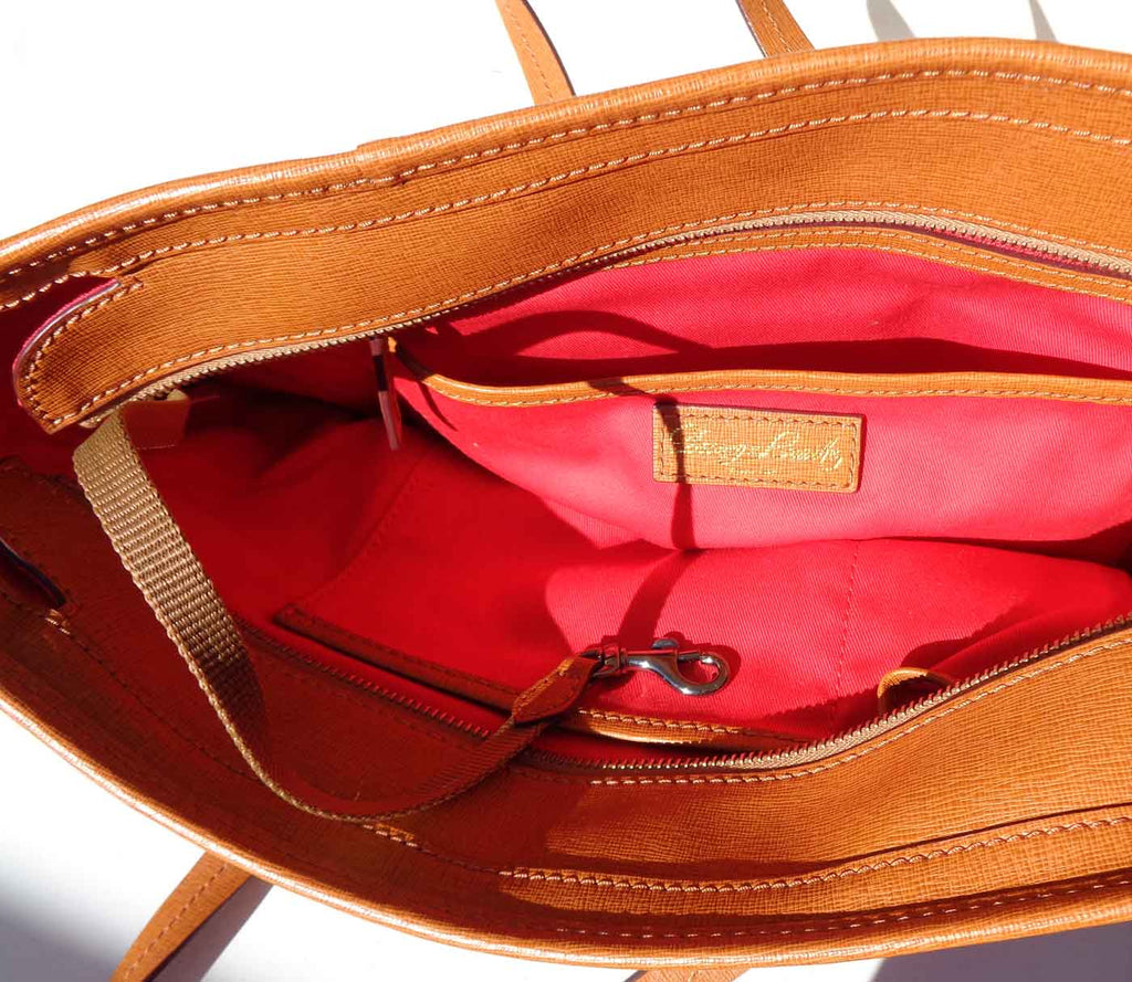 The stylish bag has a warm caramel color with textured ‘all weather leather' (AWL) body, and salmon red lined interior.