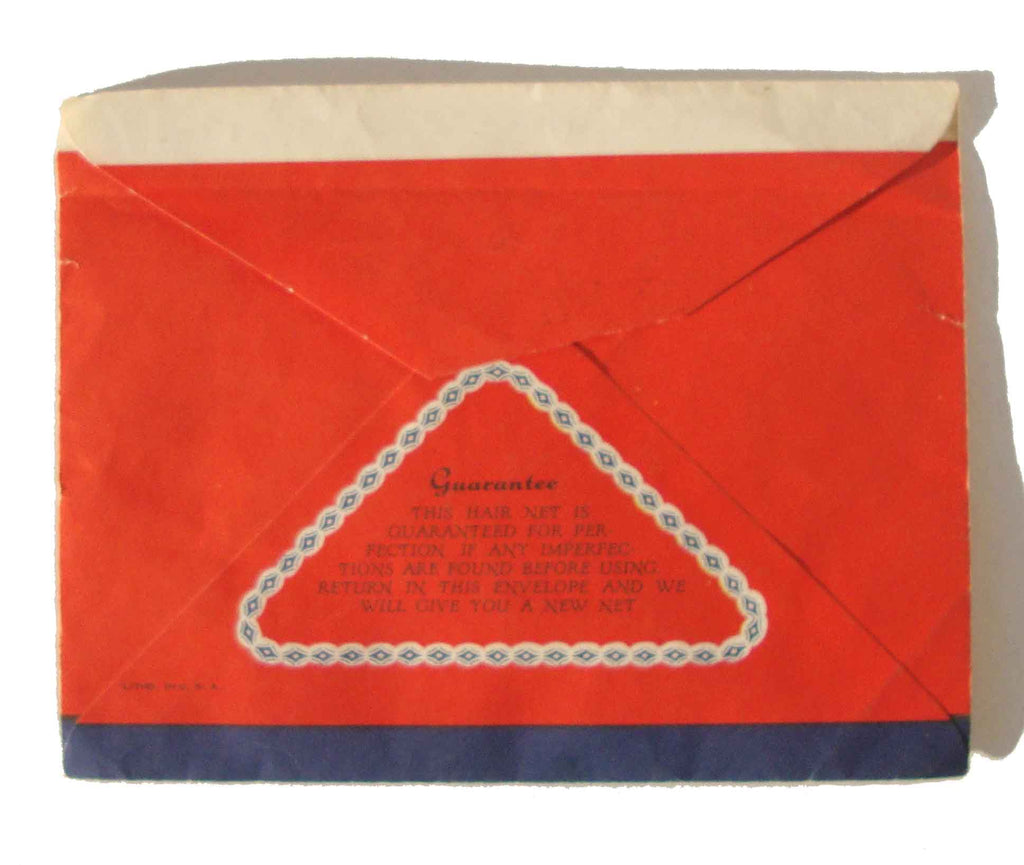 The lithograph illustrations and colors are so charming and vibrant, on these two deadstock envelope packages of "Vogue Nylon Hair Net with Elastic" – one pack with an 'extra small' sized netting and the other for chignon buns, circa early 1950s.